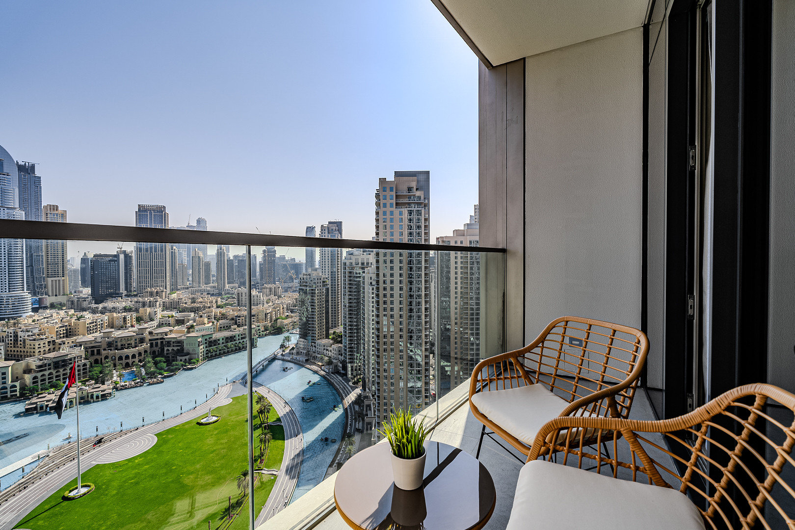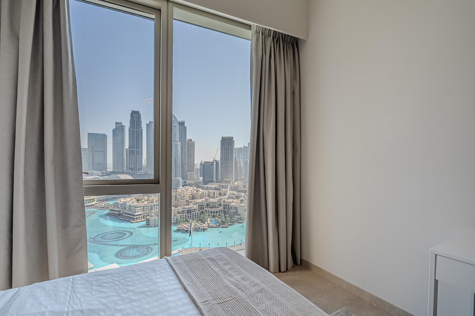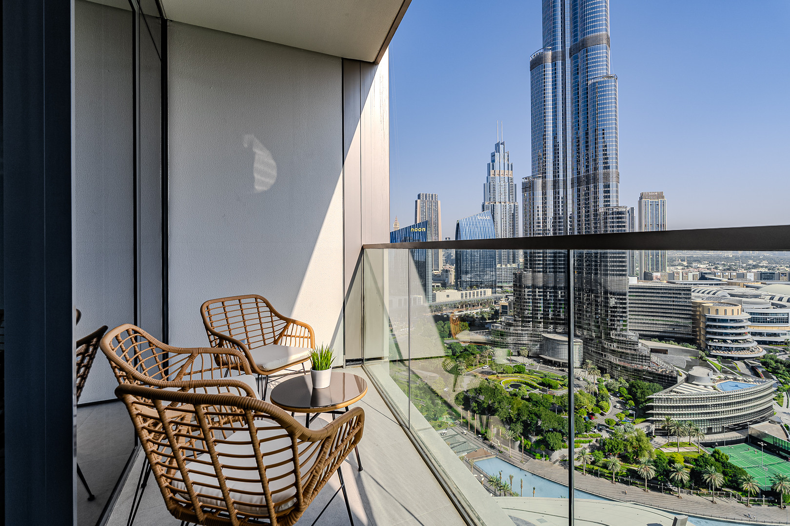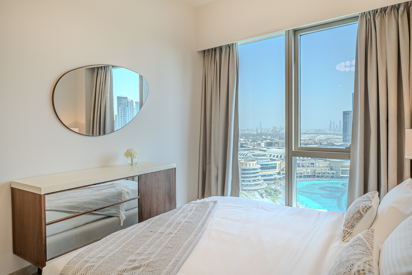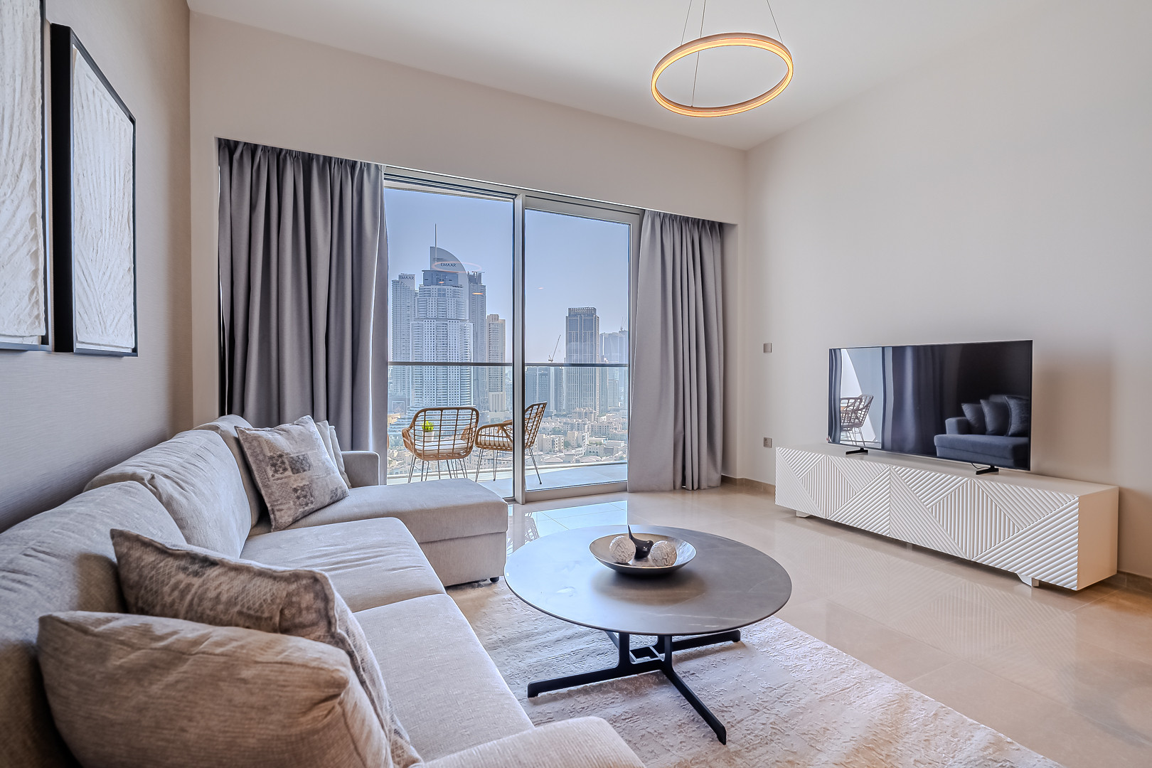 The apartment comes with exquisite views of Burj Khalifa and has an amazing vibe and plenty of natural light emerging through the floor to ceiling windows. Clean linens, minimal furnishings and a simple color scheme that coordinates beautifully with the great outdoors makes this space welcoming. The light-filled living room has a very welcoming and comforting ambience. Styled with a large sofa, smart TV and dining area – this apartment will fascinate you with its functionality and simplicity. The kitchen is fully equipped with all appliances and the modern bathrooms are filled with toiletries. The bedrooms are well put together with king size bed topped with high quality pallet, fresh linen and towels. Our guests can simply move in and start living as this lovely apartment is equipped with everything they might need, to ensure a smooth and perfect stay!