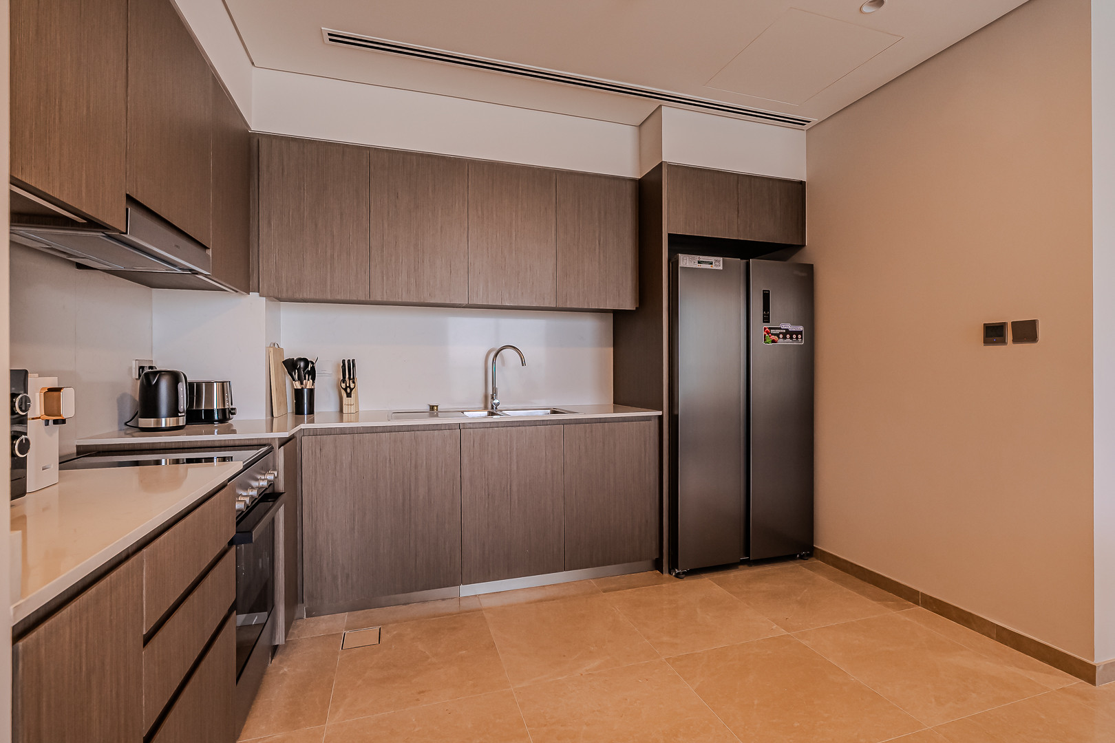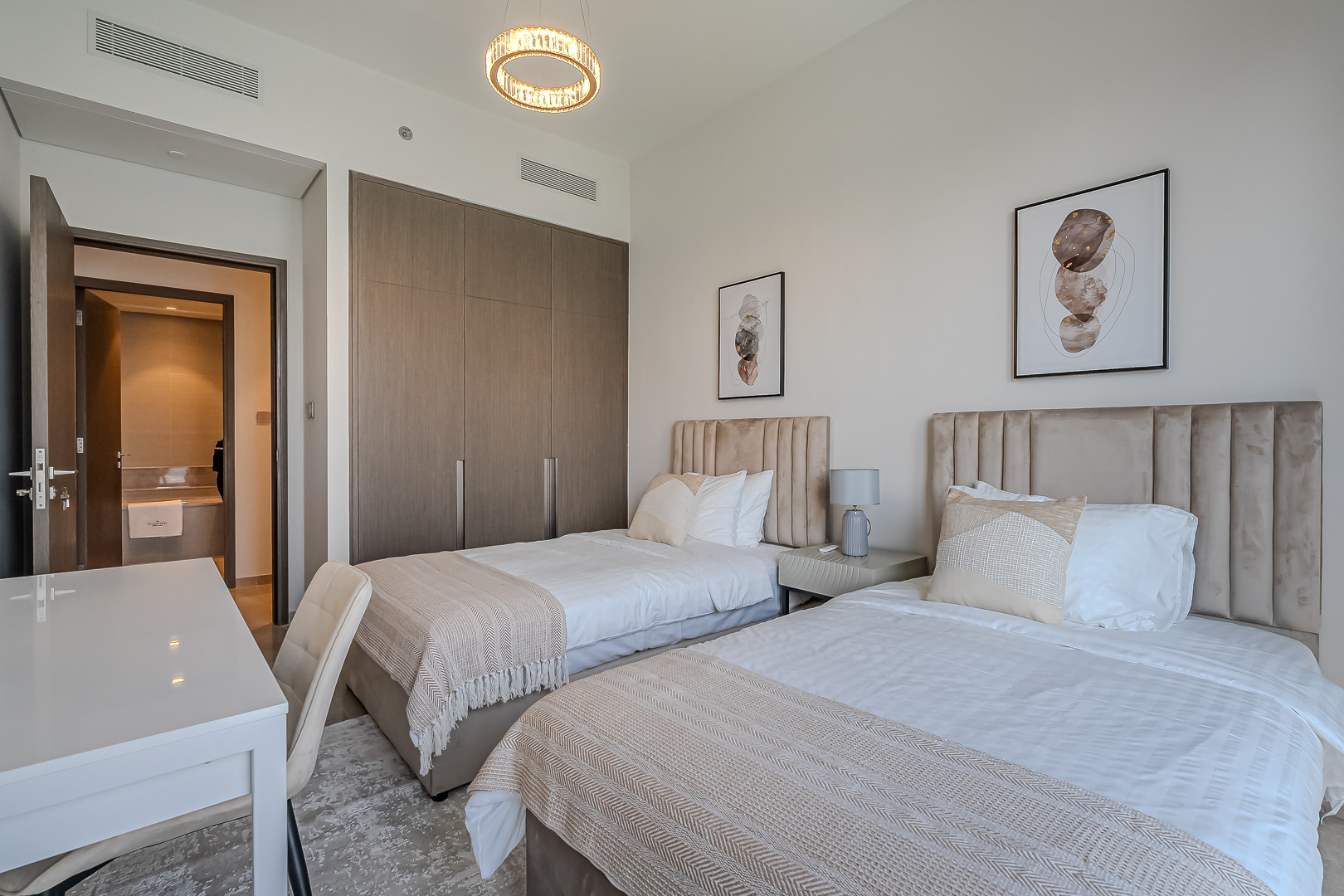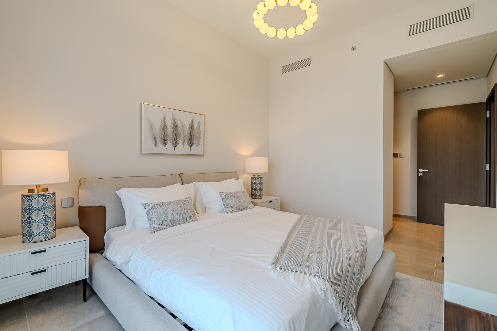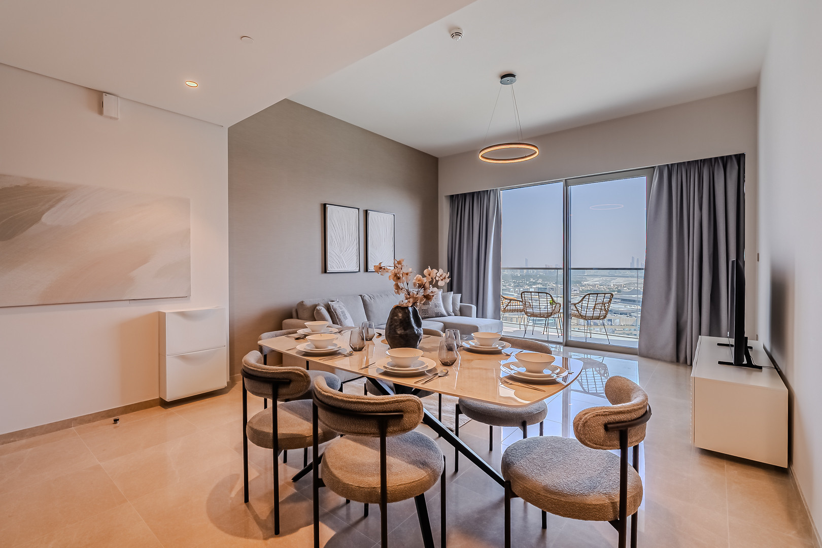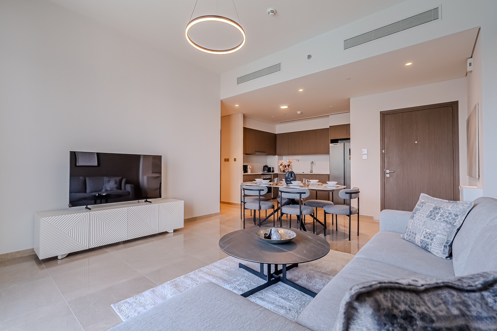 The apartment comes with exquisite views of Burj Khalifa and has an amazing vibe and plenty of natural light emerging through the floor to ceiling windows. Clean linens, minimal furnishings and a simple color scheme that coordinates beautifully with the great outdoors makes this space welcoming. The light-filled living room has a very welcoming and comforting ambience. Styled with a large sofa, smart TV and dining area – this apartment will fascinate you with its functionality and simplicity. The kitchen is fully equipped with all appliances and the modern bathrooms are filled with toiletries. The bedrooms are well put together with king size bed topped with high quality pallet, fresh linen and towels. Our guests can simply move in and start living as this lovely apartment is equipped with everything they might need, to ensure a smooth and perfect stay!