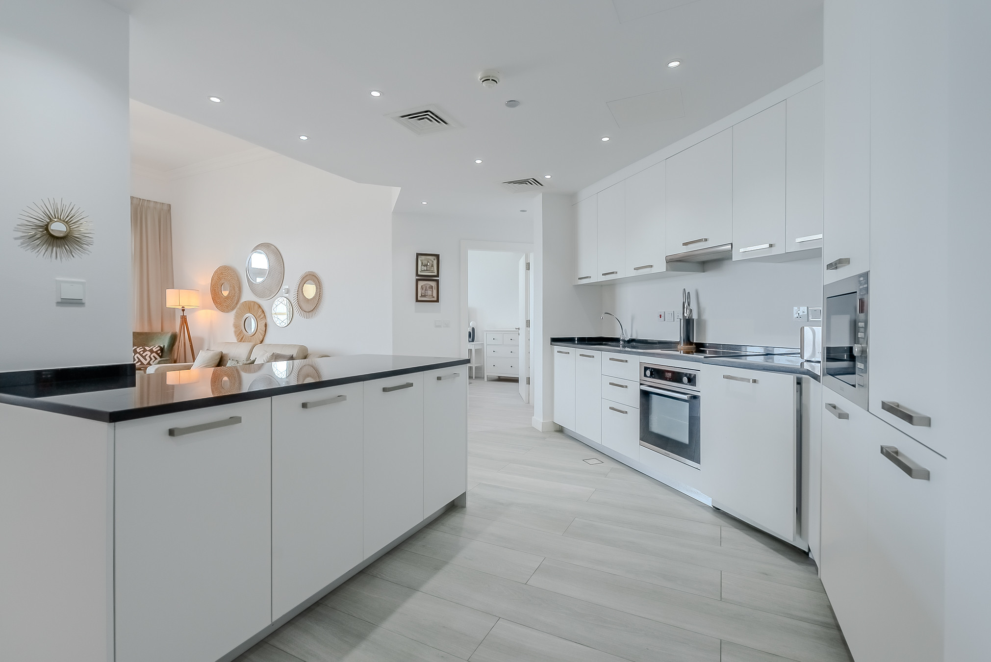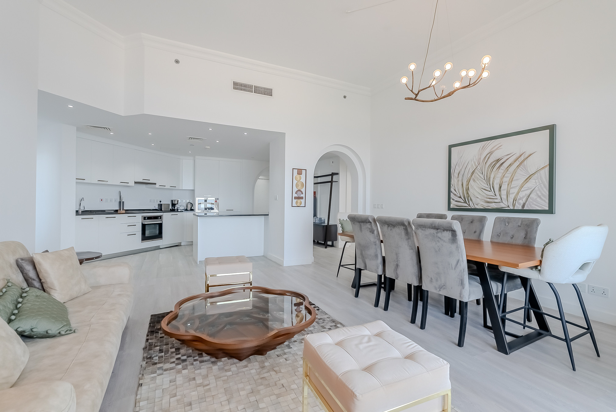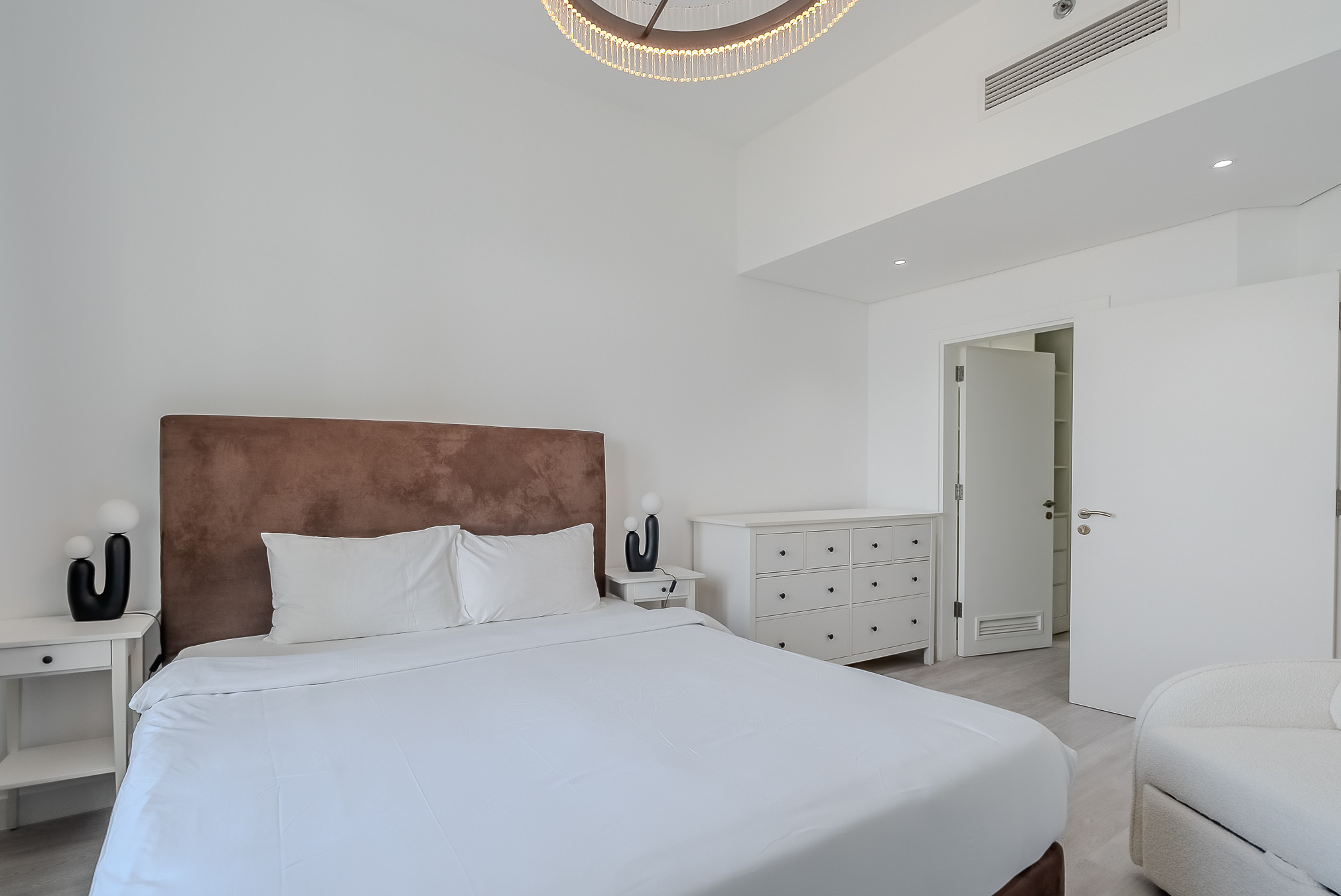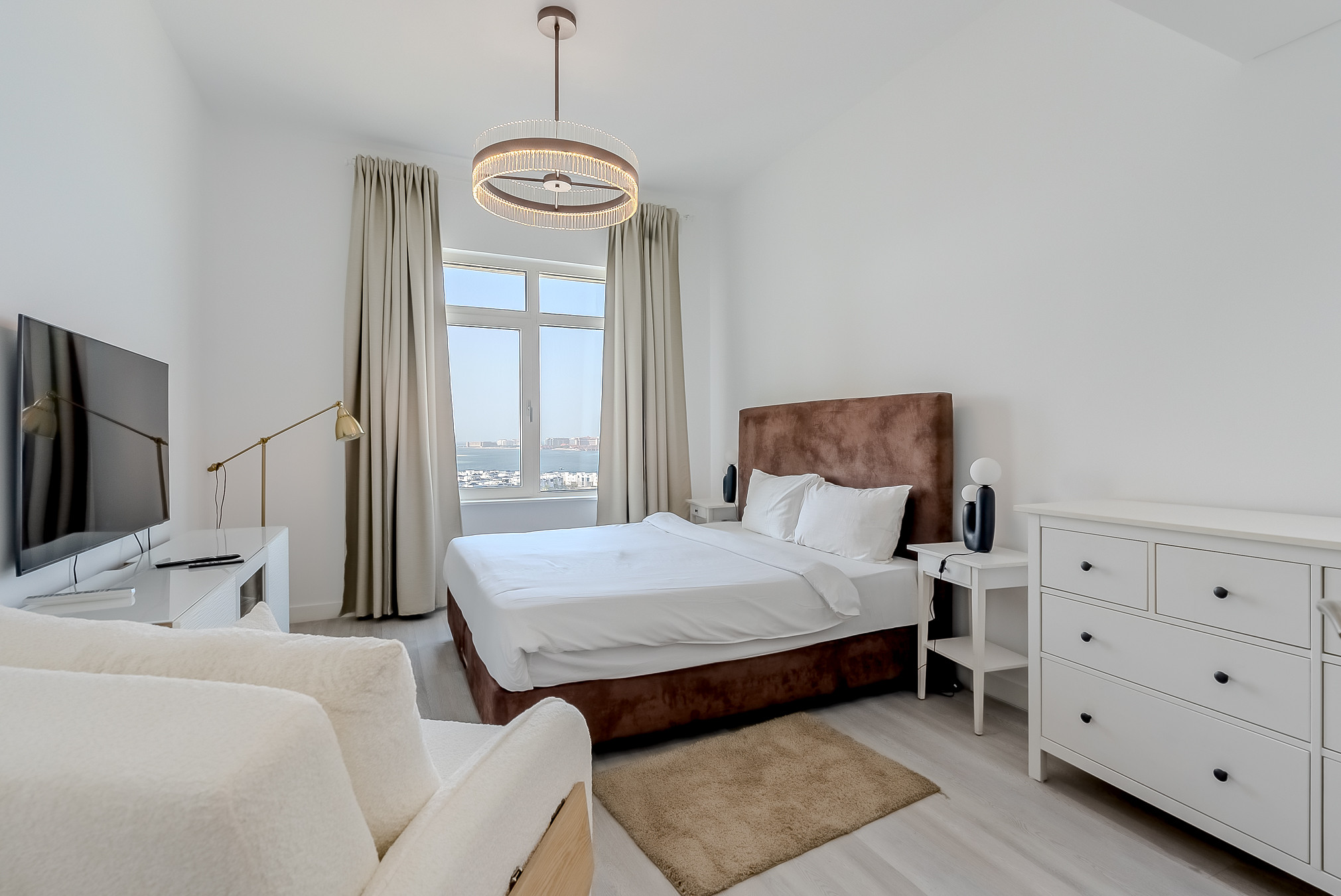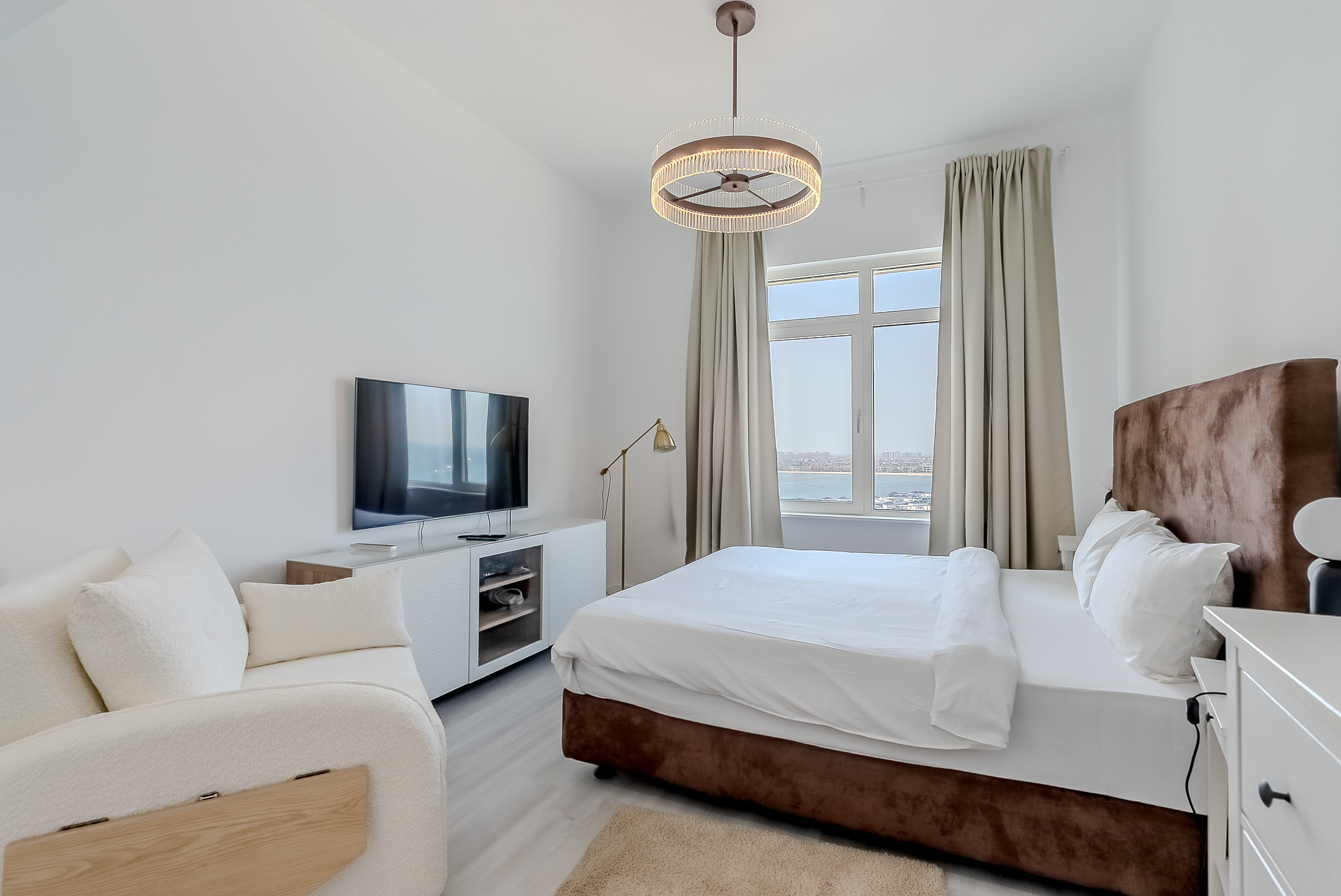 Comfort and simplicity are expressed in this 2 bedroom apartment located on The Palm featuring full sea view. The apartment is designed with modern and practical elements which provides maximum comfort and the best experience during your visit in Dubai. Located on The Palm, close to the beach , it’s perfect for single traveler and families. This newly renovated apartment is bright and welcoming, it consists of a spacious living room with a sofa , smart TV and dining area, semi closed fully equipped kitchen. The bedroom’s design is sea-inspired with white undertones mixed with soft turquoise color creating a very calm and tranquil atmosphere. The rooms features en-suite bathrooms filled with toiletries and the bed is well set with high quality matrass and linen. With the lure of living by the sea, we invite you to explore this coastal paradise in the comfort of your own home.