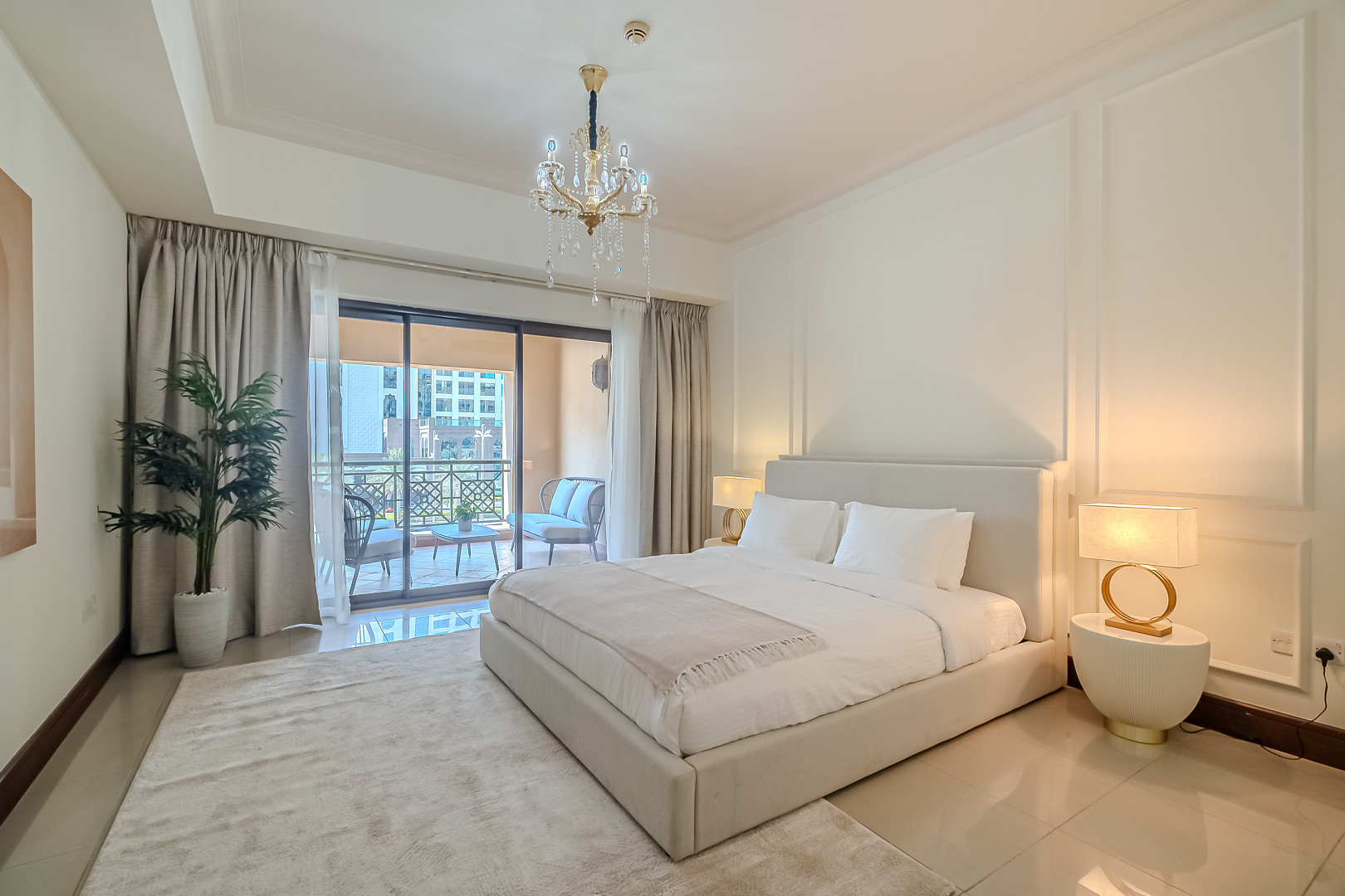 A newly furnished 1-bedroom apartment with balcony located on The Palm – Golden Mile - perfect for those who want to enjoy the serenity of beach life, the apartment’s design is light and airy that leans into a natural and aesthetic look. This brand new 1-bedroom apartment features high-end luxury furniture and a modern design. The layout is spacious and embraces warm undertones that creates a vibrant atmosphere. The tastefully designed living room is styled with a large sofa, smart TV and dining area, creating a simple and fresh look. The rooms are spacious and thoughtfully styled with a minimalistic and trendy touch, the beds are well set with fresh linens and high-quality matrasses. The property features a fully equipped kitchen with all appliances, modern bathrooms filled with toiletries and storage facilities. The apartment is very cozy, spacious, and ready to move in, with all the appliances to ensure a smooth and perfect stay.