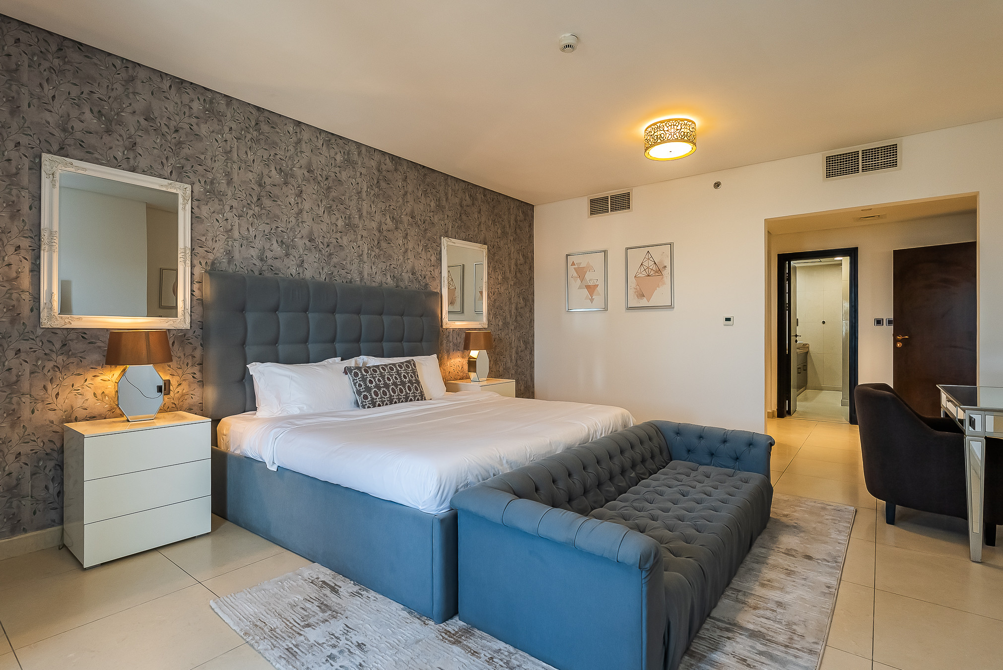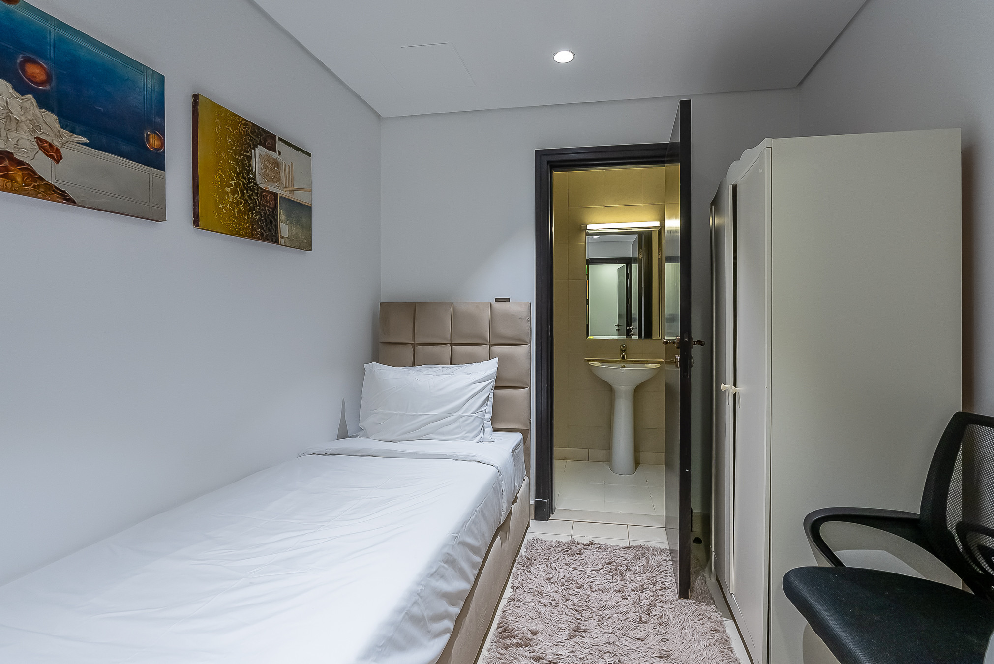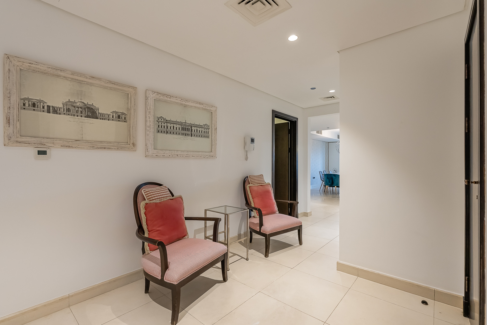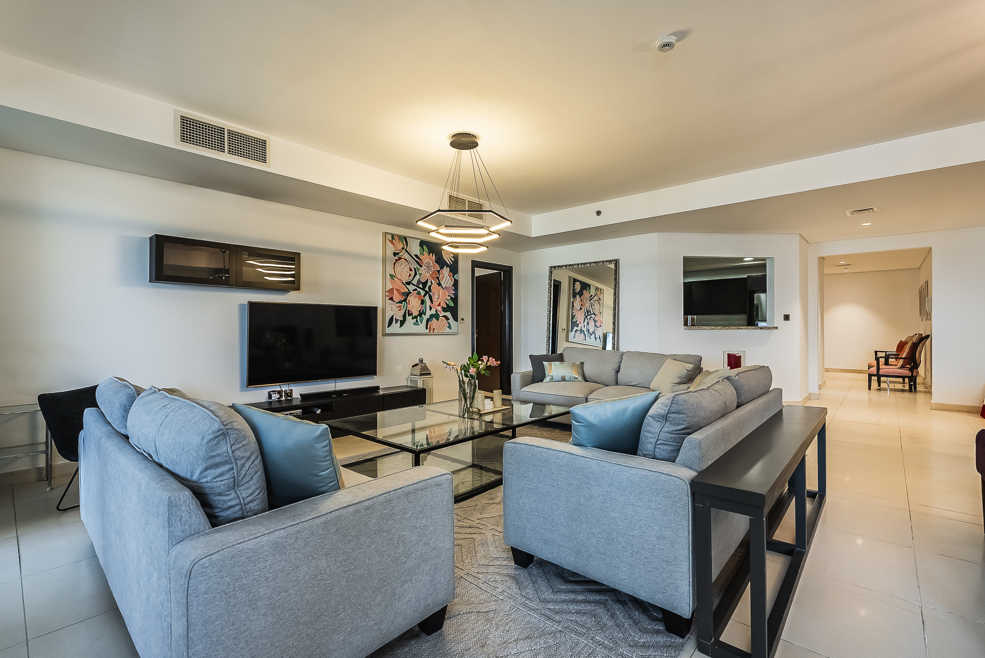 The bedroom is thoughtfully designed with high quality furniture and bed settings also full private bathroom in each bedroom and in maid’s room, + 1 guest bathroom. The property features a fully equipped kitchen with all appliances ,modern bathrooms filled with toiletries and storage facilities. The living room is well put together with a modern twist and a classic look, with a large sofa, smart TV and dining area overseeing beautiful views of the city and sea view. You will discover an apartment with high-end luxury furniture and a contemporary design that creates an inviting atmosphere.