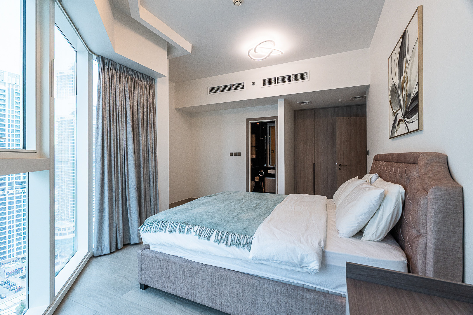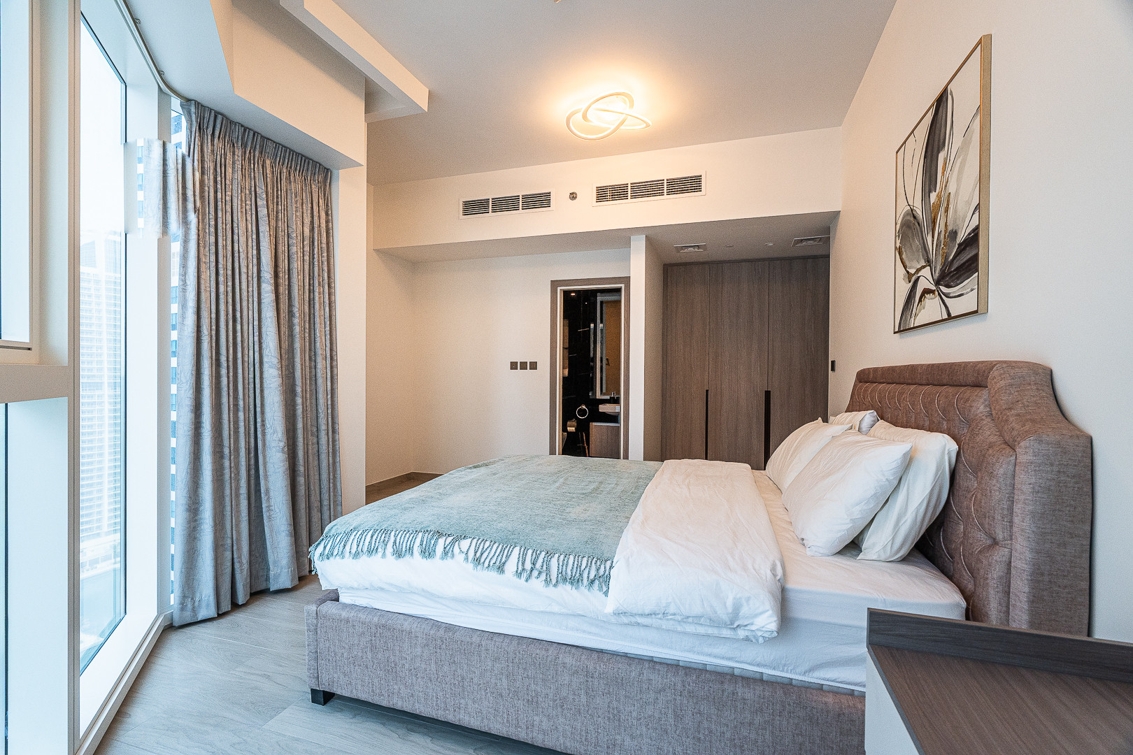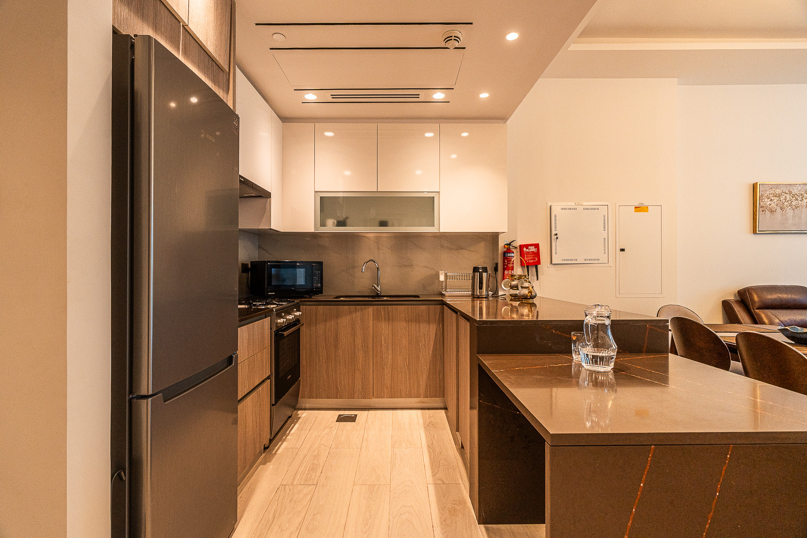 Designed with modern comfort and practicality in mind, the apartment features a plush king-size bed with high-quality linens and fresh towels, a fully equipped kitchen with all essential appliances, and a sleek modern bathroom stocked with toiletries and smart storage. There's also a cozy dining area and a chic vanity corner for added convenience.