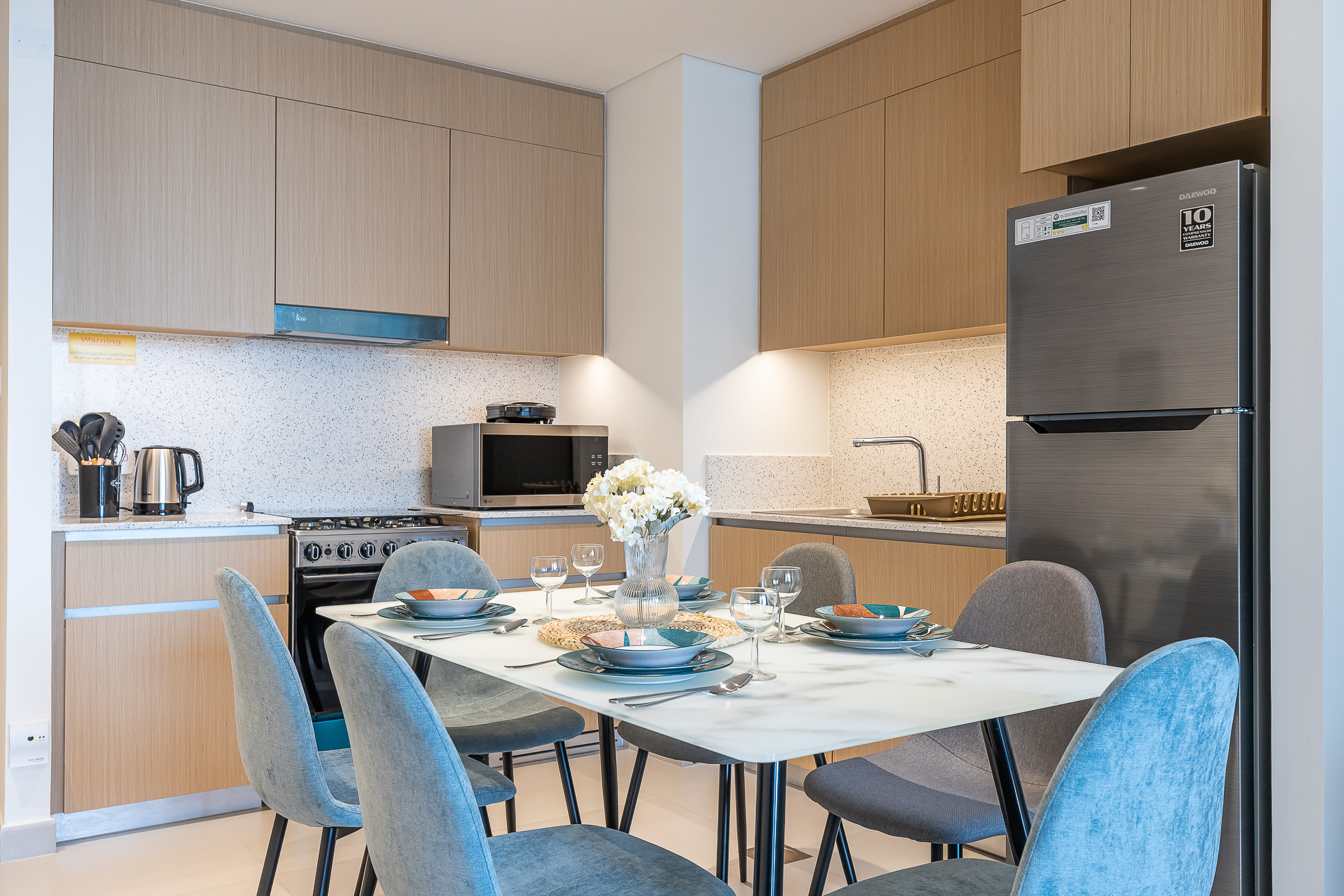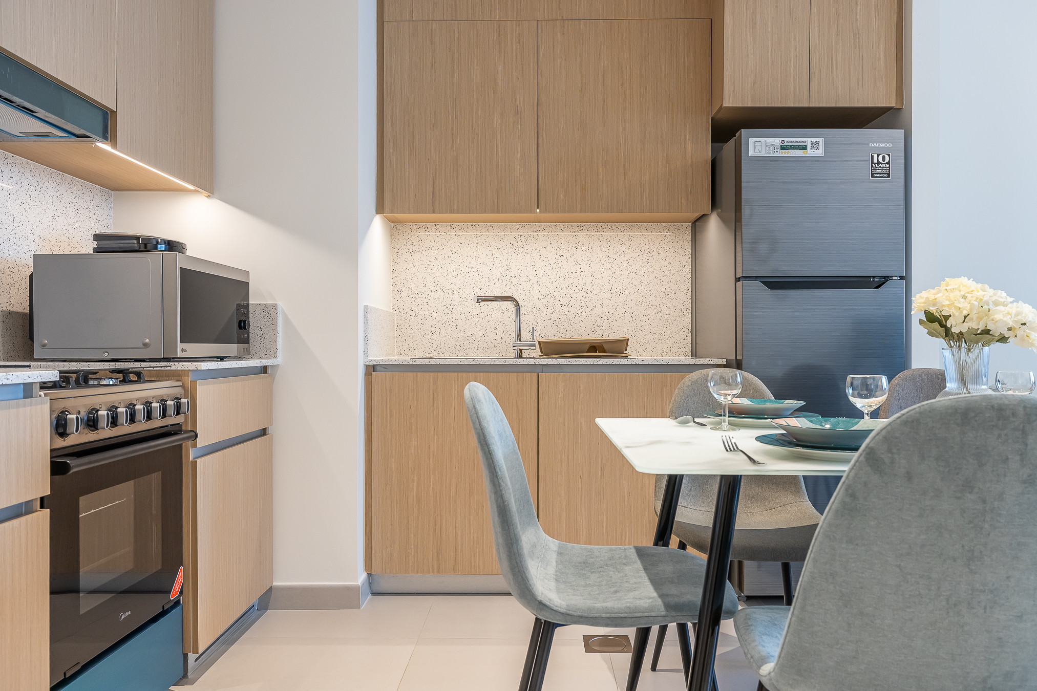 Eccentric and fully equipped 1 bedroom apartment located in Dubai Creek Harbour. The space is a perfect balance between elegance and functionality. Designed with stylish furniture, the ambience of the apartment is welcoming, embracing & warm which is designed with soft undertones. The living room is spacious, featuring large sofa- bed, smart TV and dining area. The bedroom is styled with a minimalistic and modern touch. The kitchen consists of high-quality appliances like stove, microwave , toaster, water kettle ,cooking pots , Nespresso coffee machine .The bathroom is filled with toiletries and the bed is covered with fresh linen and towels. All utilities are included (Electricity, water, High Speed Internet, TV with Cable Channels, AC/Chiller) ,Access to all building/community facilities, such as the pool and the gym for all the residents.