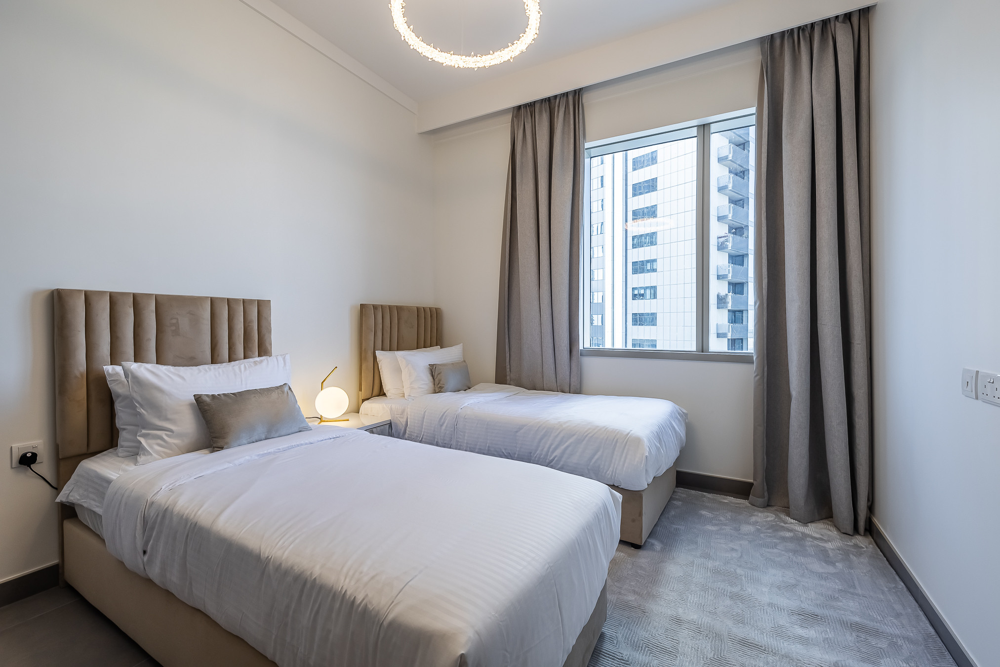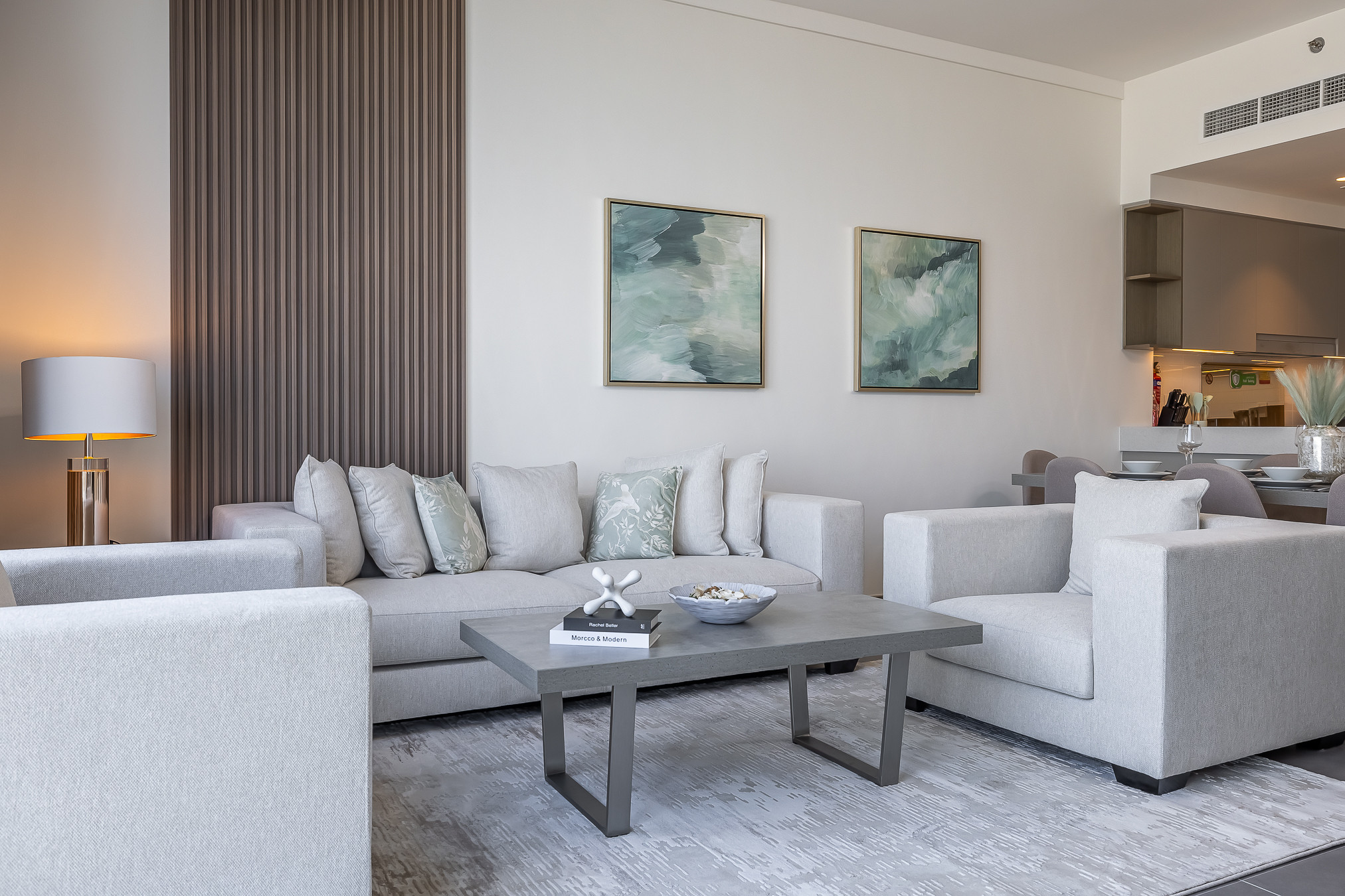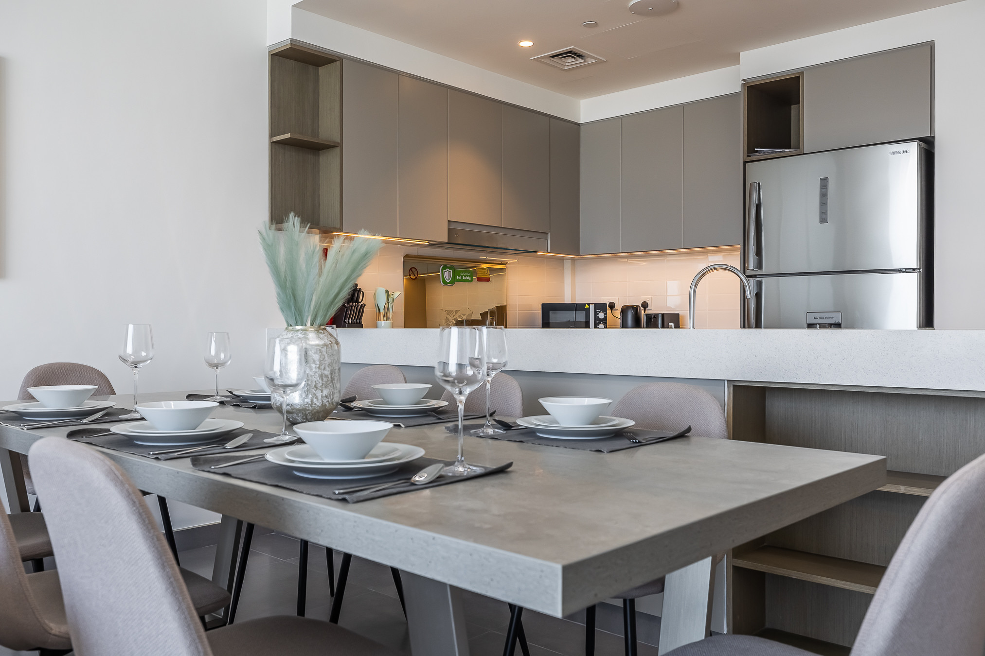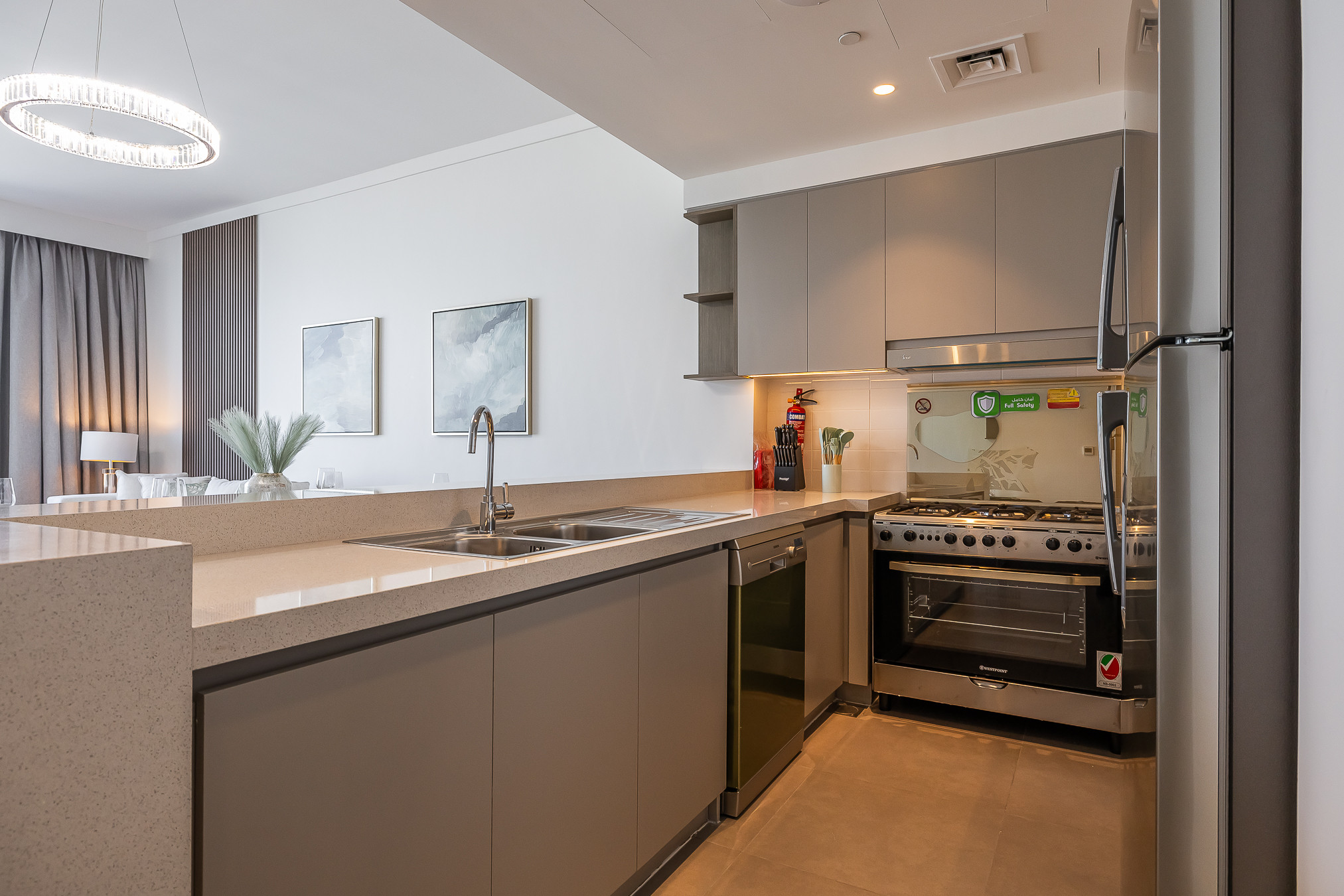 The apartment is fully equipped with a modern kitchen (including all appliances), 3 well-designed bedrooms with king-size beds, and a maid’s room for added convenience. Each bathroom is thoughtfully stocked with toiletries, fresh towels, and storage.