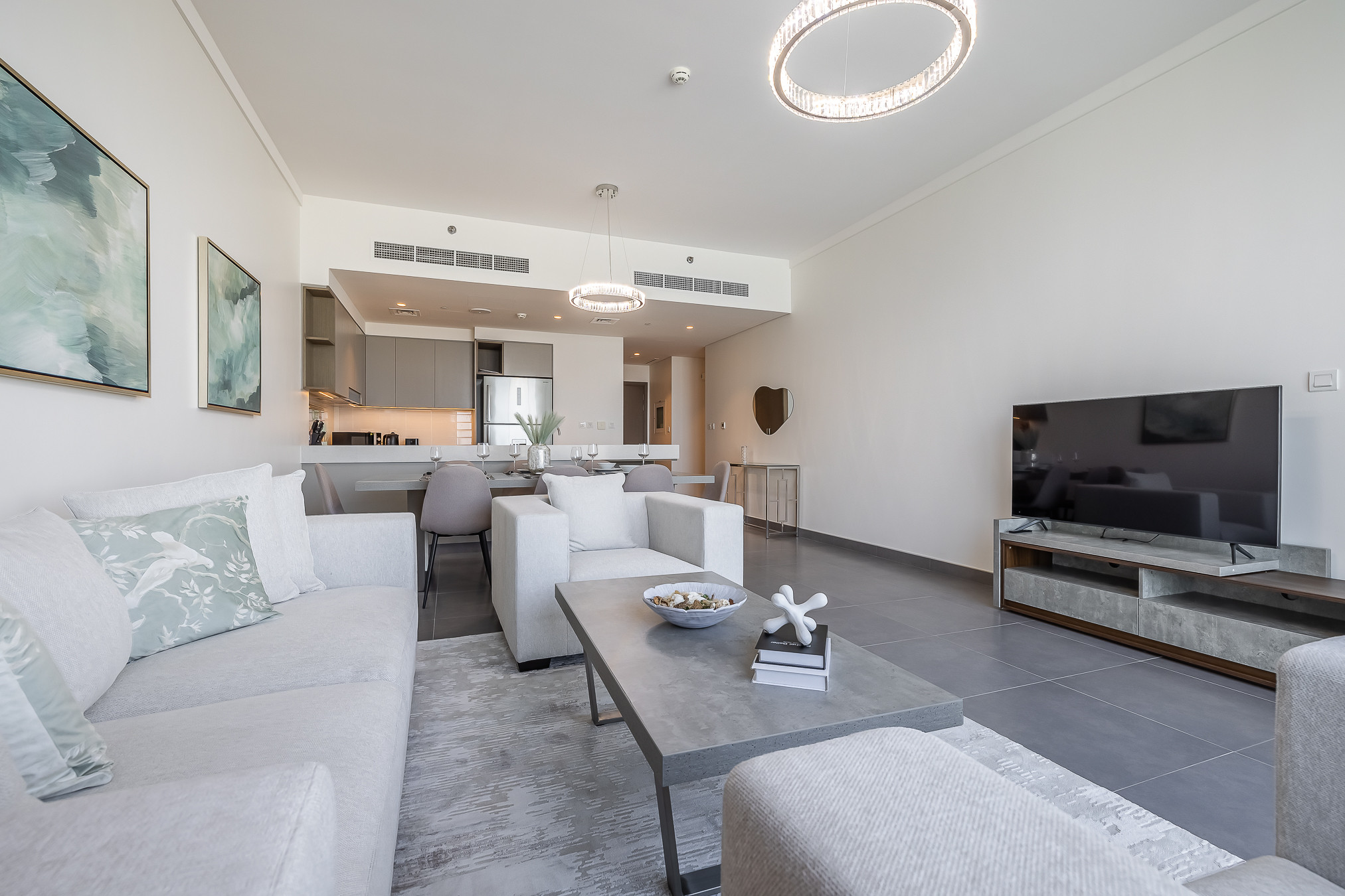 The interior embraces minimalist elegance, enhanced by neutral tones and soft textures that reflect the tranquility of the surrounding environment. The sunlit living room features a large plush sofa, smart TV, and a cozy dining area — ideal for family moments or relaxed evenings.