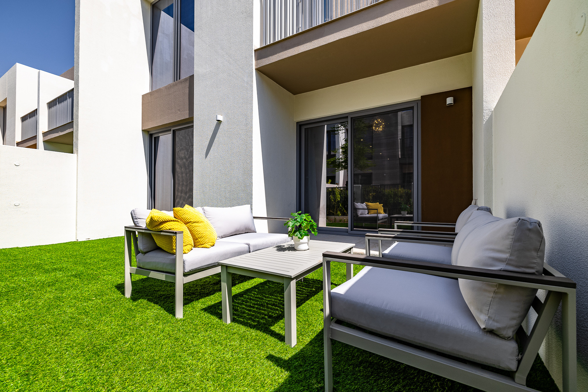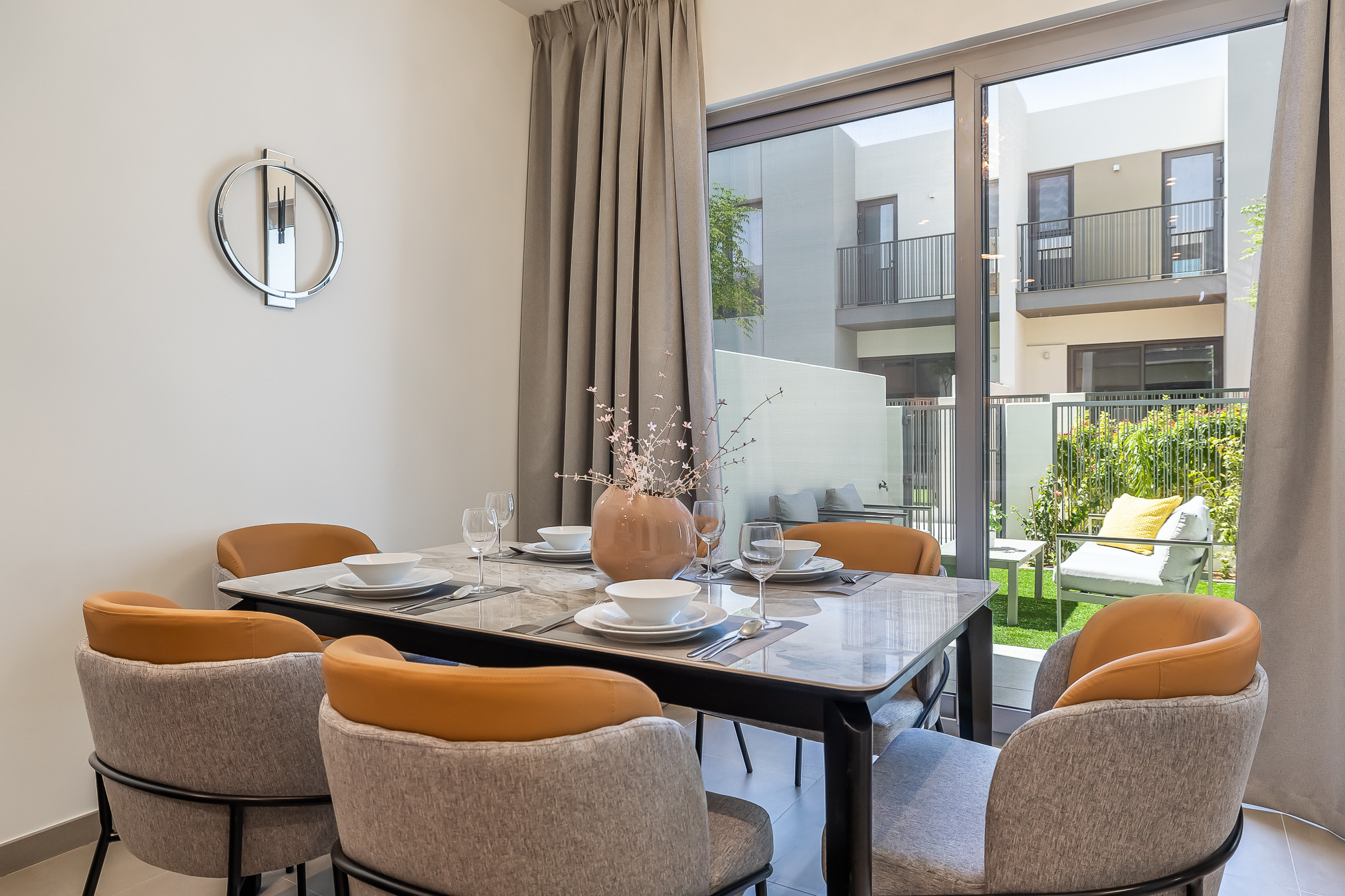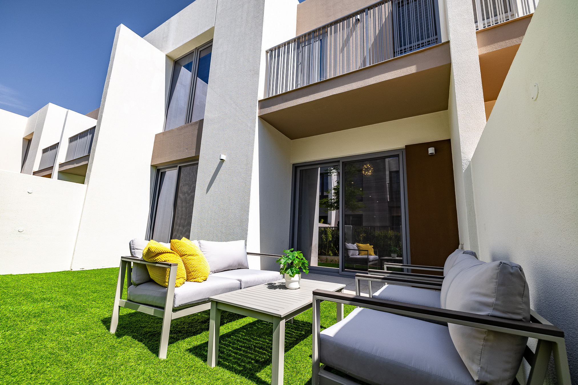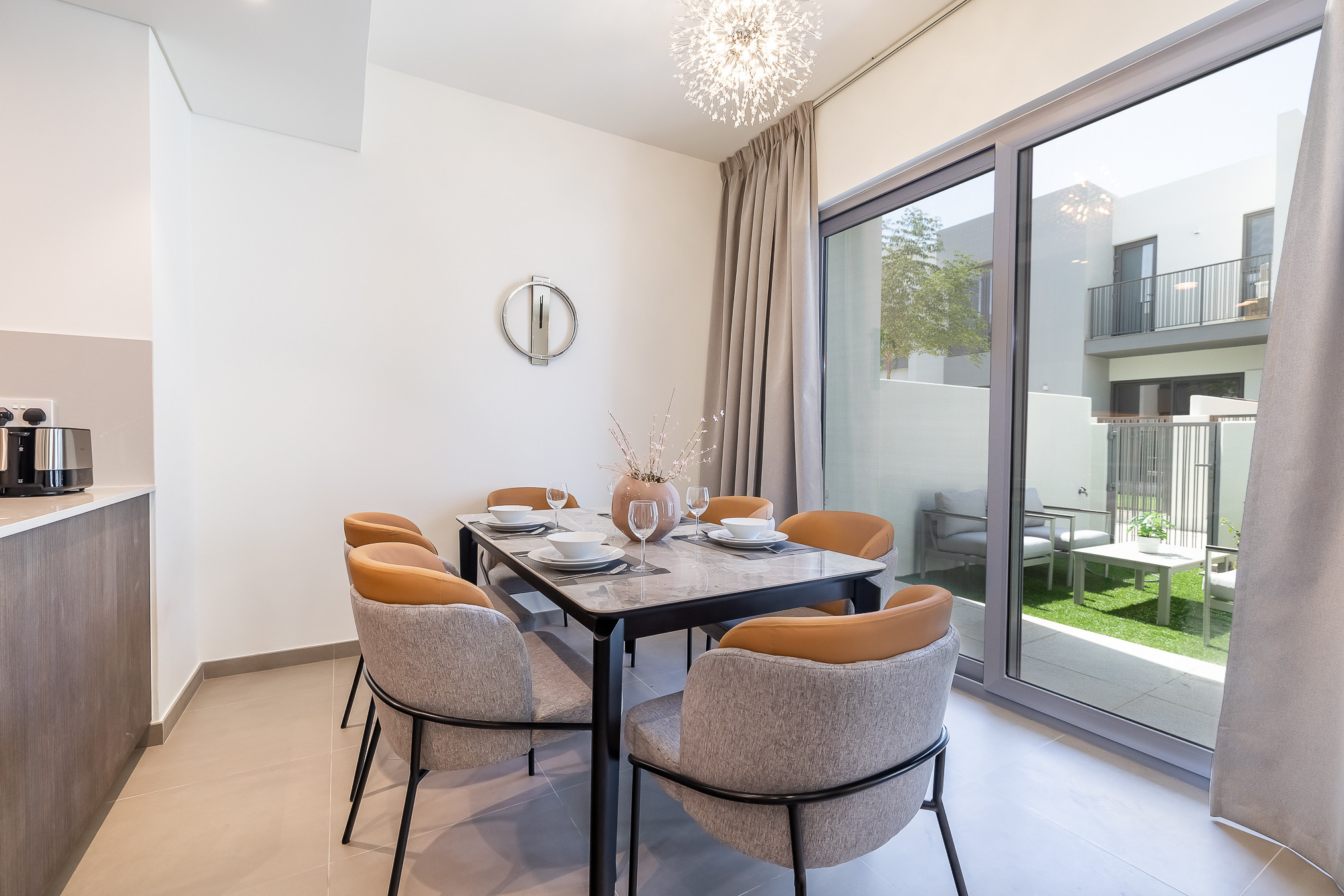 Elegant 3 bedrooms villa located close to Arabian Ranches & Sports city. The villa has a perfect ambience with plenty of natural light emitting through the windows. Clean linens, minimal furnishings and a simple color scheme that coordinates beautifully with the great outdoors making this space welcoming. Living room is styled with a large sofa, smart TV with the dining area. This property will amaze you with its functionality and simplicity. The kitchen is fully equipped with all appliances and the modern bathrooms are filled with toiletries. The villa consists of 3 bedrooms and maid room with it’s own bathroom. The bedrooms are well put together with king size bed topped with high quality pallet, fresh linen, and towels. The bedrooms have en-suite bathrooms and own balconies . Guest can enjoy the back garden fitted with sitting area, as well we provide free bicycles for easier movement around community. Our guests can simply move in and start living as this lovely villa is equipped with everything they might need, to ensure a smooth and perfect stay!