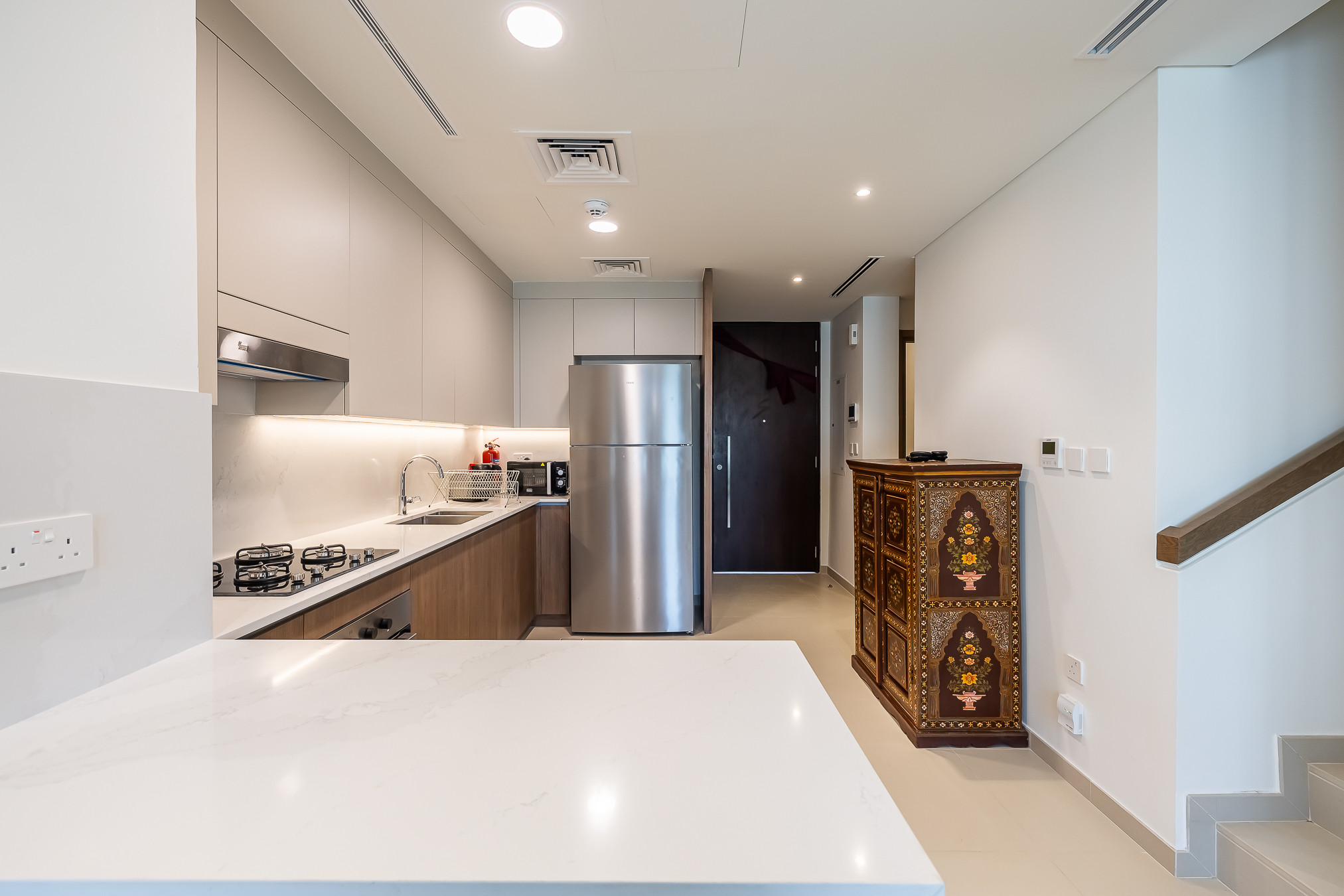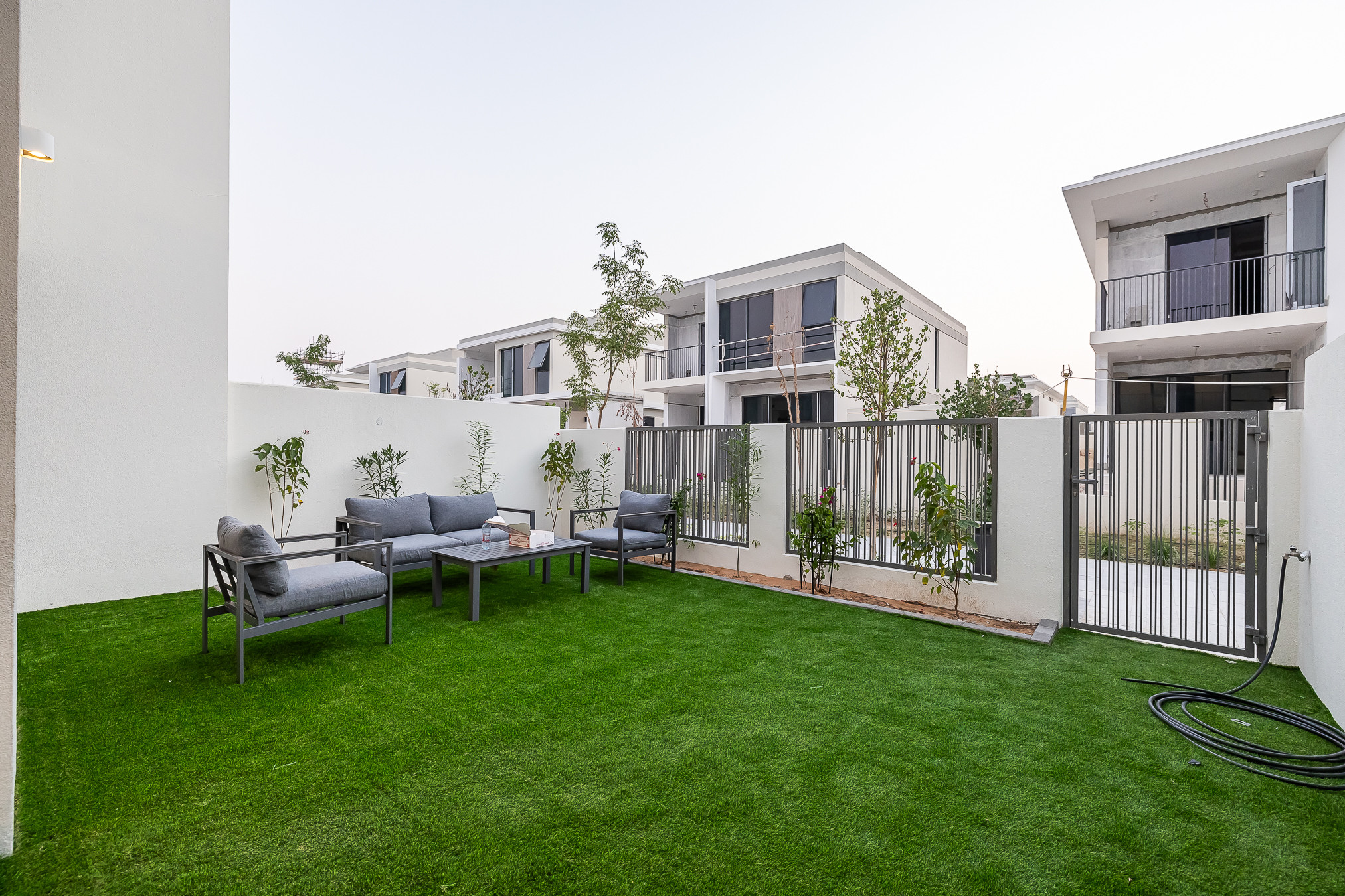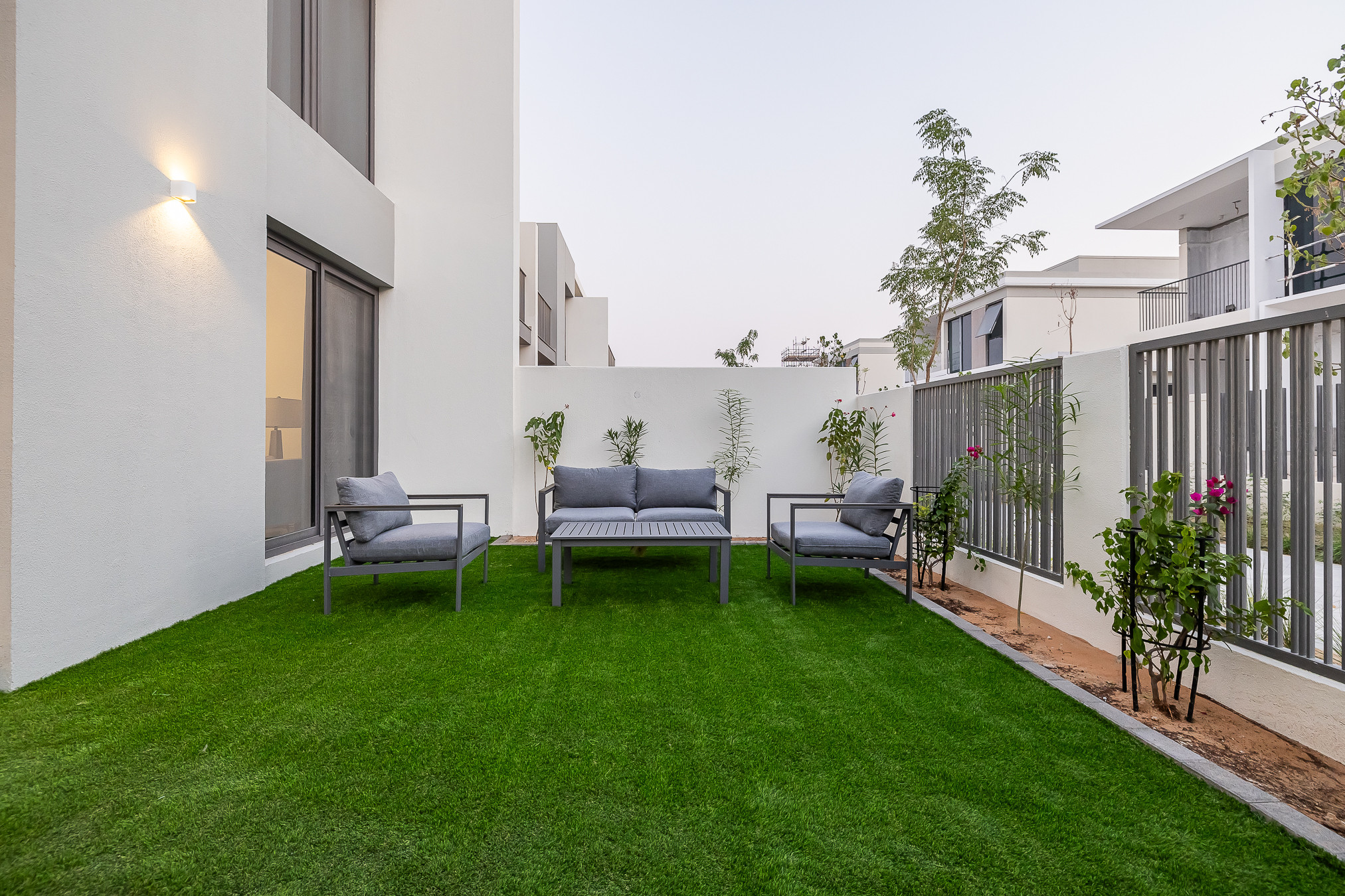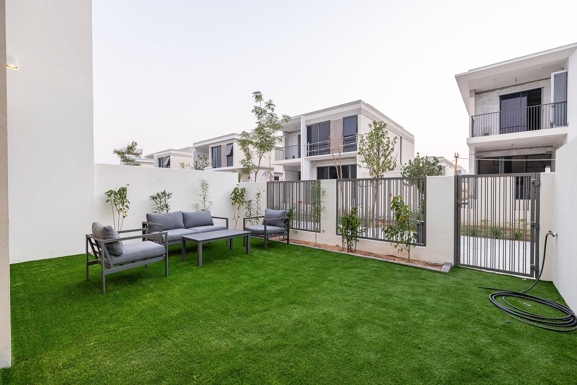 Exquisite 3 bedrooms villa located in Tilal Al Ghaf. The villa has a perfect ambience with plenty of natural light emitting through the windows. Clean linens, minimal furnishings and a simple color scheme that coordinates beautifully with the great outdoors making this space welcoming. Living room is styled with a large sofa, smart TV with the dining area. This property will amaze you with its functionality and simplicity. The kitchen is fully equipped with all appliances and the modern bathrooms are filled with toiletries. The villa consists of 3 bedrooms and maid room with it’s own bathroom. The bedrooms are well put together with king size bed topped with high quality pallet, fresh linen, and towels. The bedrooms have en-suite bathrooms and own balconies . Guest can enjoy the back garden fitted with sitting area, as well we provide free bicycles for easier movement around community. Our guests can simply move in and start living as this lovely villa is equipped with everything they might need, to ensure a smooth and perfect stay!