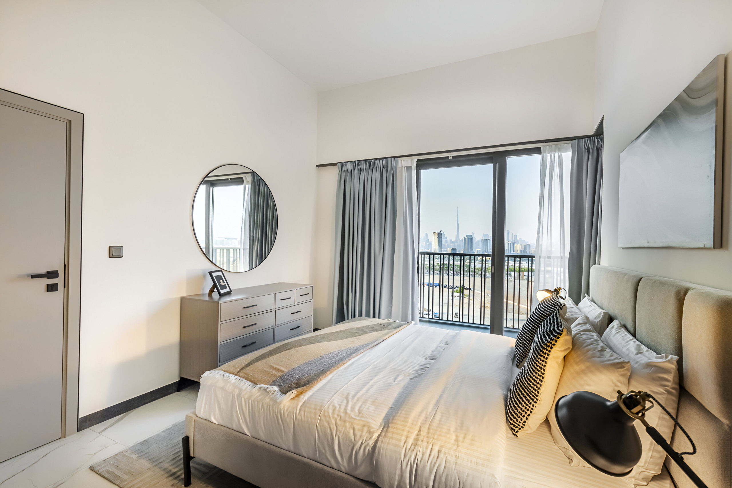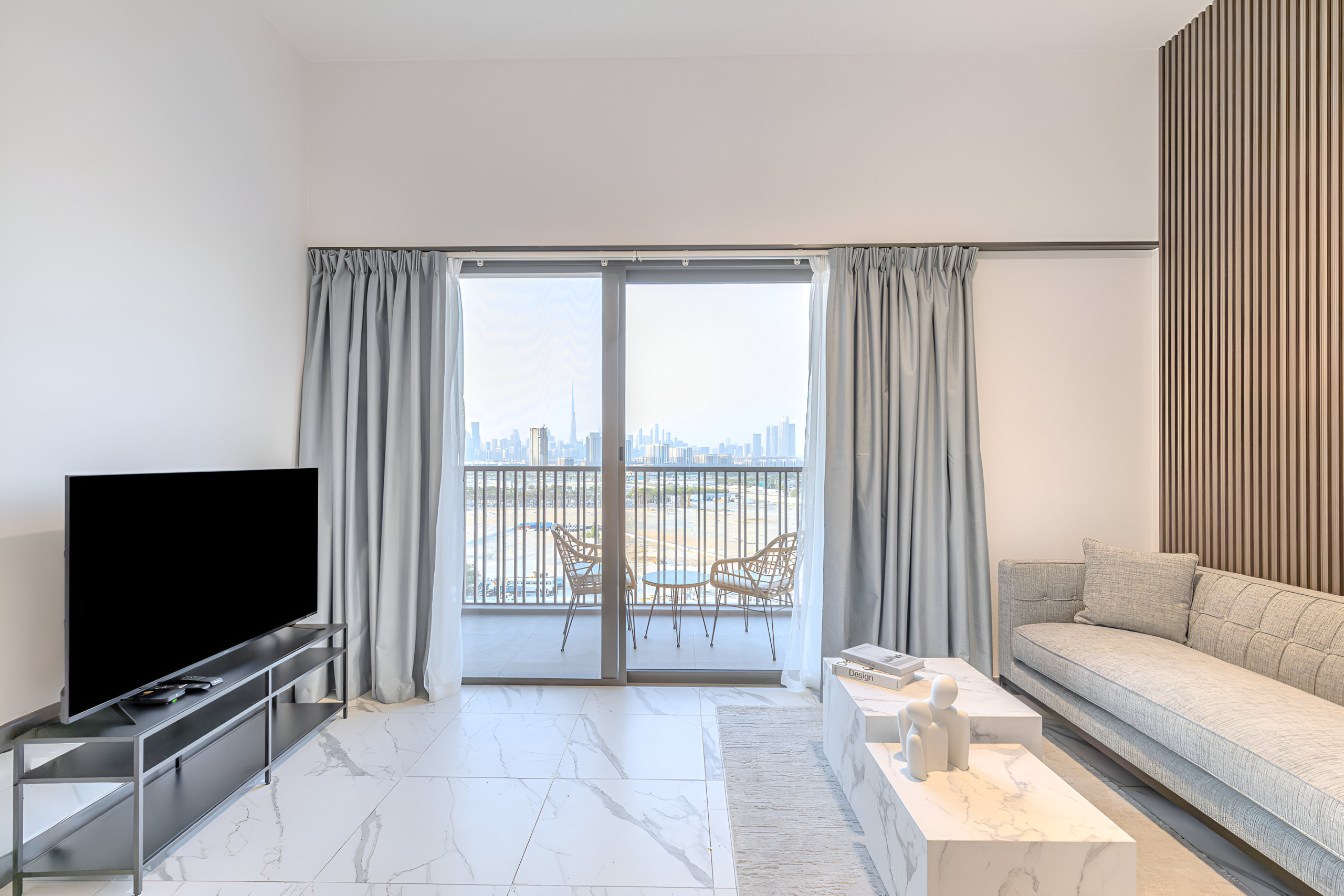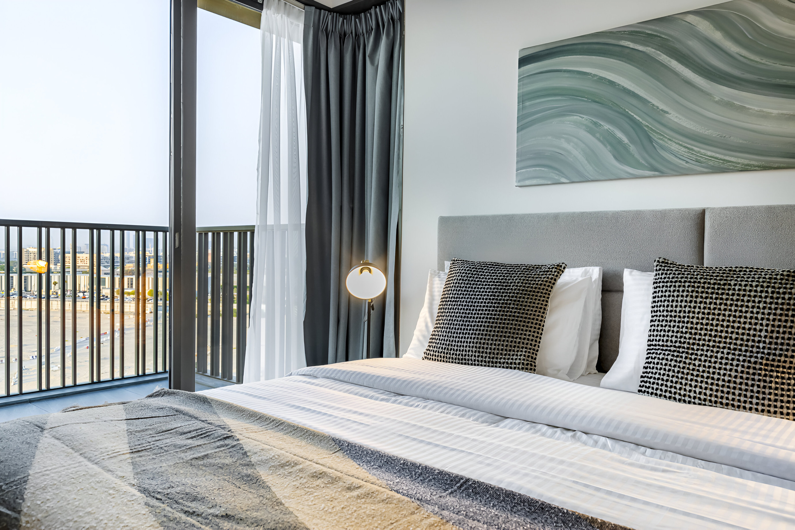 Pristine one bedroom apartment located in District Seven , Mohammed Bin Rashid City. The property features high ceilings , large windows , balcony that opens towards Burj Khalifa view. The apartment has contemporary style decoration in combination with original wooden elements and come together with shades of light tone, making the apartment an exquisite elegance. The bedroom is equipped with bed topped with high-quality mattress, wardrobe, and en-suite bathroom filled with toiletries and fresh towels. The living room, is fitted with a large sofa, modern flat-screen TV and a big dining table with four chairs. The kitchen is fully equipped with all appliances. The apartment is very cozy, spacious, and ready to move in, with all the appliances to ensure a smooth and perfect stay.