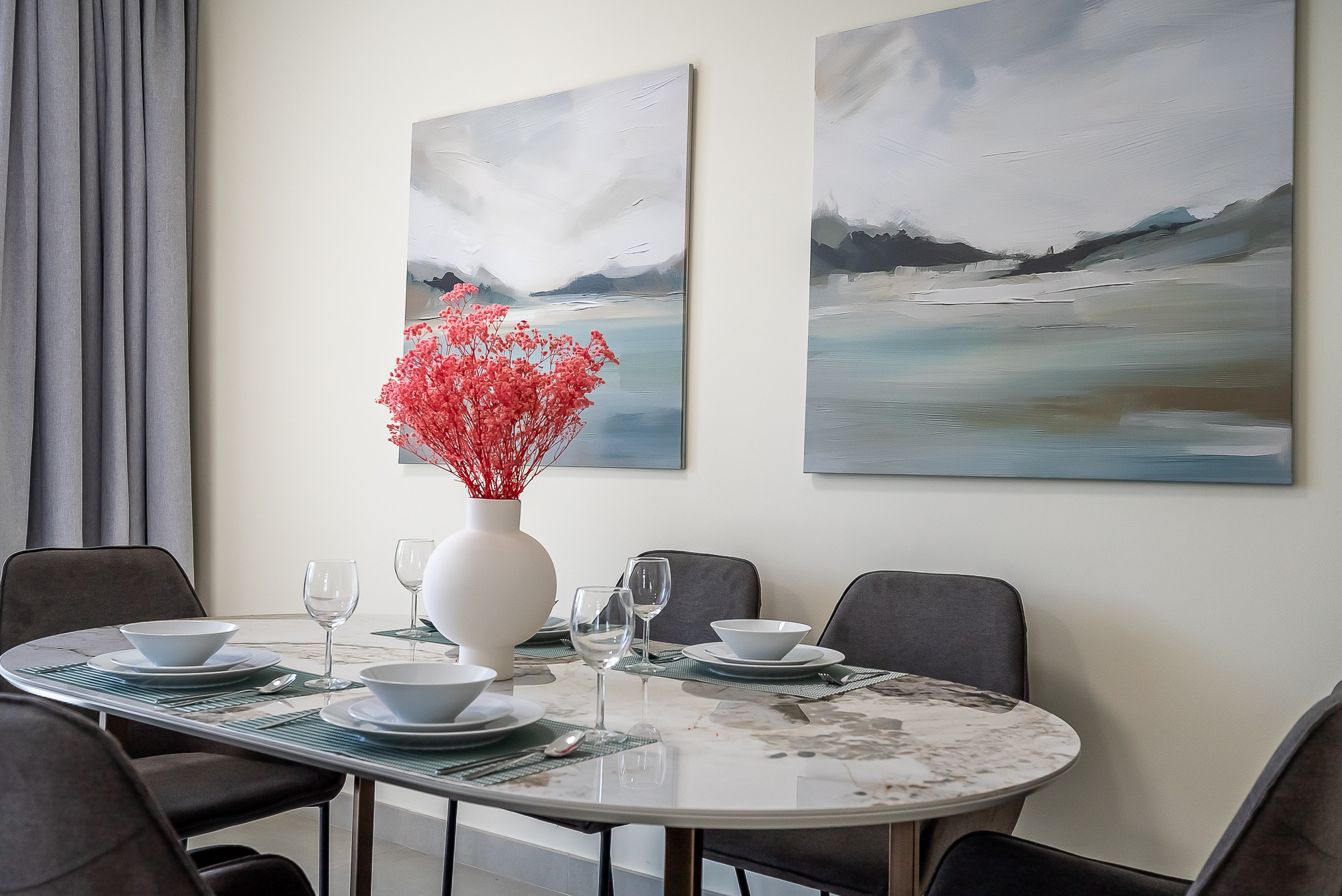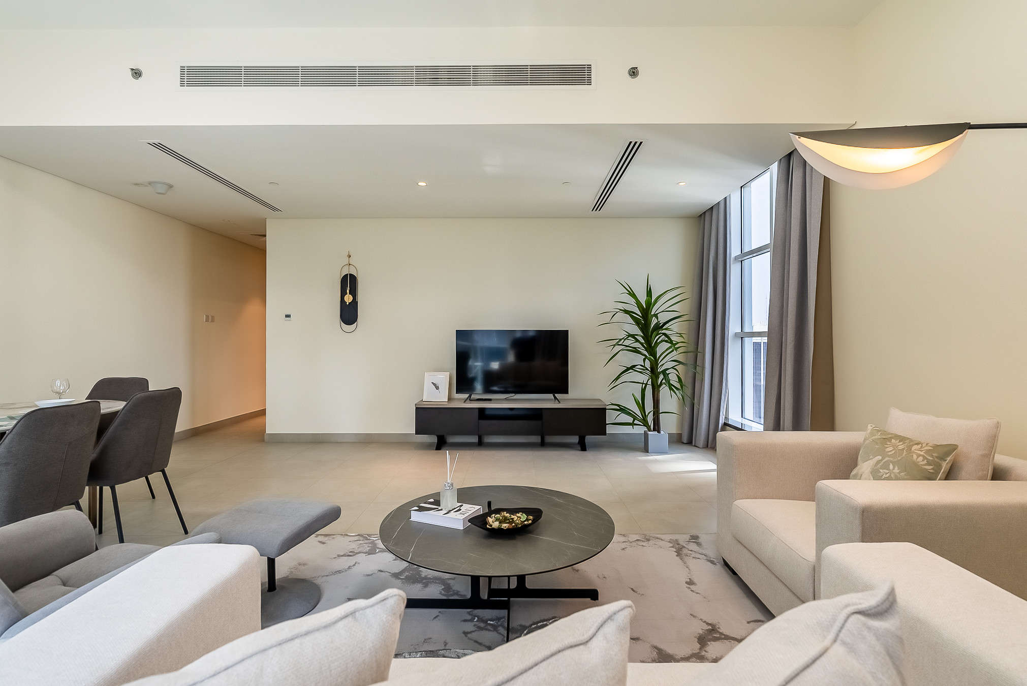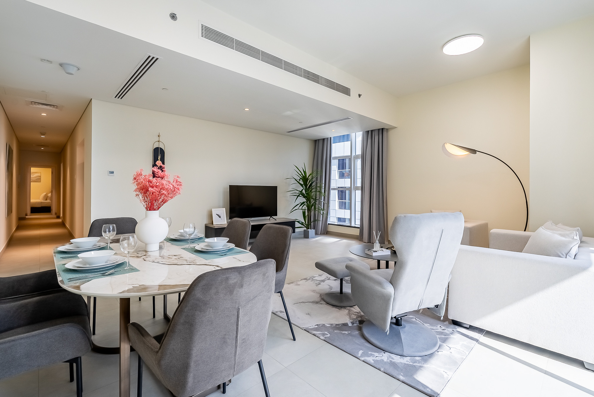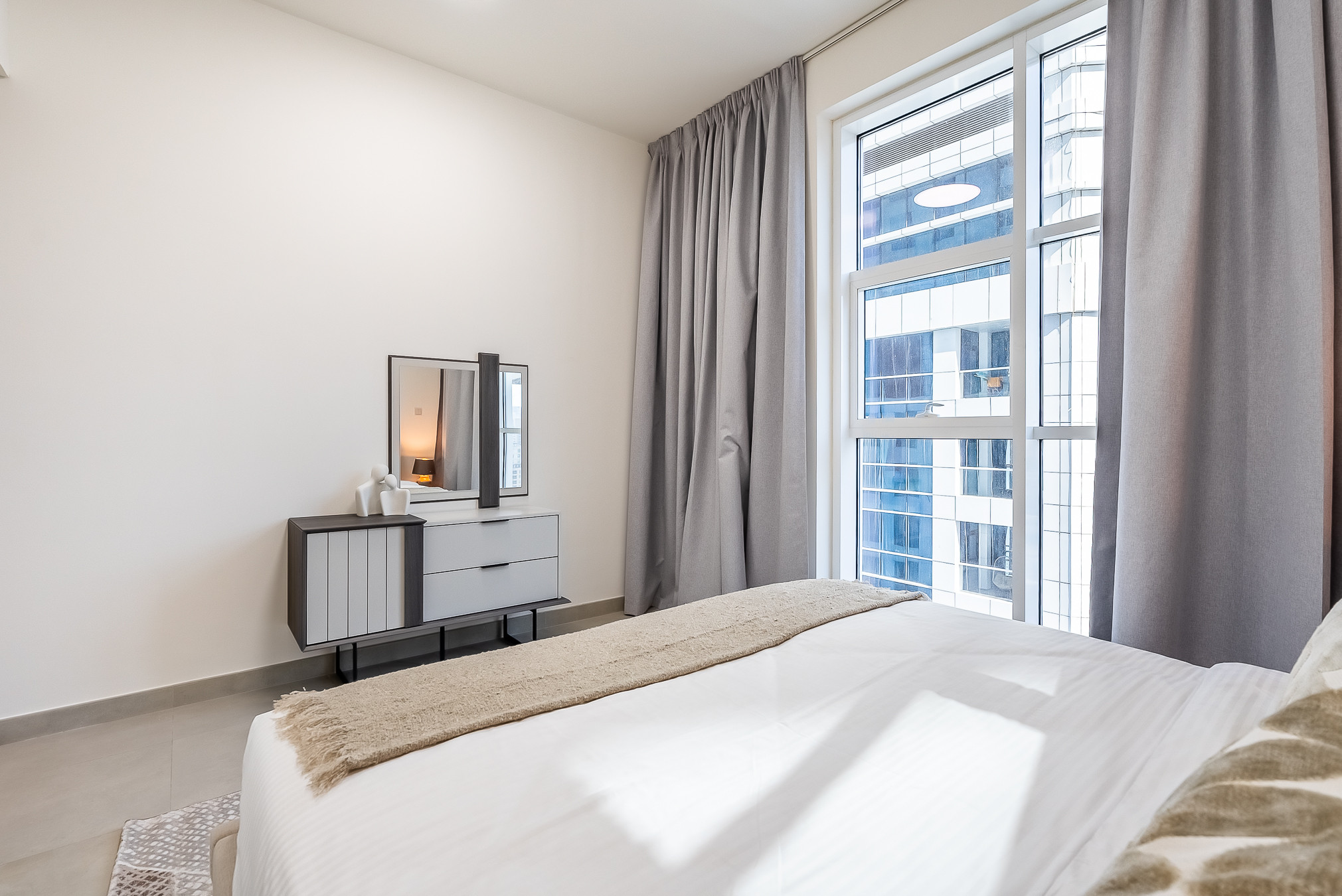 Guests will feel at home in this multi-functional 2-bedroom apartment by having everything needed for a comfortable stay. There is floor to ceiling windows which opens towards beautiful Dubai Marina views. The bedrooms are thoughtfully designed with high quality furniture and bed settings. The kitchen is fully equipped with all the appliances, refrigerator, dishwasher, microwave, oven, freezer, washing machine, waffle maker dishes/cutlery, kitchen utensils, coffee machine, toaster, kettle, vacuum. The property features modern bathroom filled with toiletries and storage facilities. The living room feels lush, vibrant, and cozy, with a large sofa, smart TV and dining area overseeing beautiful views of Marina. The soft sofa, artwork and coordinating cushions pull the living room together for a modern twist on a classic look. The guests can enjoy the spacious living room with a big dinning table fit for 6 people and an office corner , perfect for business travelers as well. The apartment is very cozy, spacious, and ready to move in, with all the appliances to ensure a smooth and perfect stay.