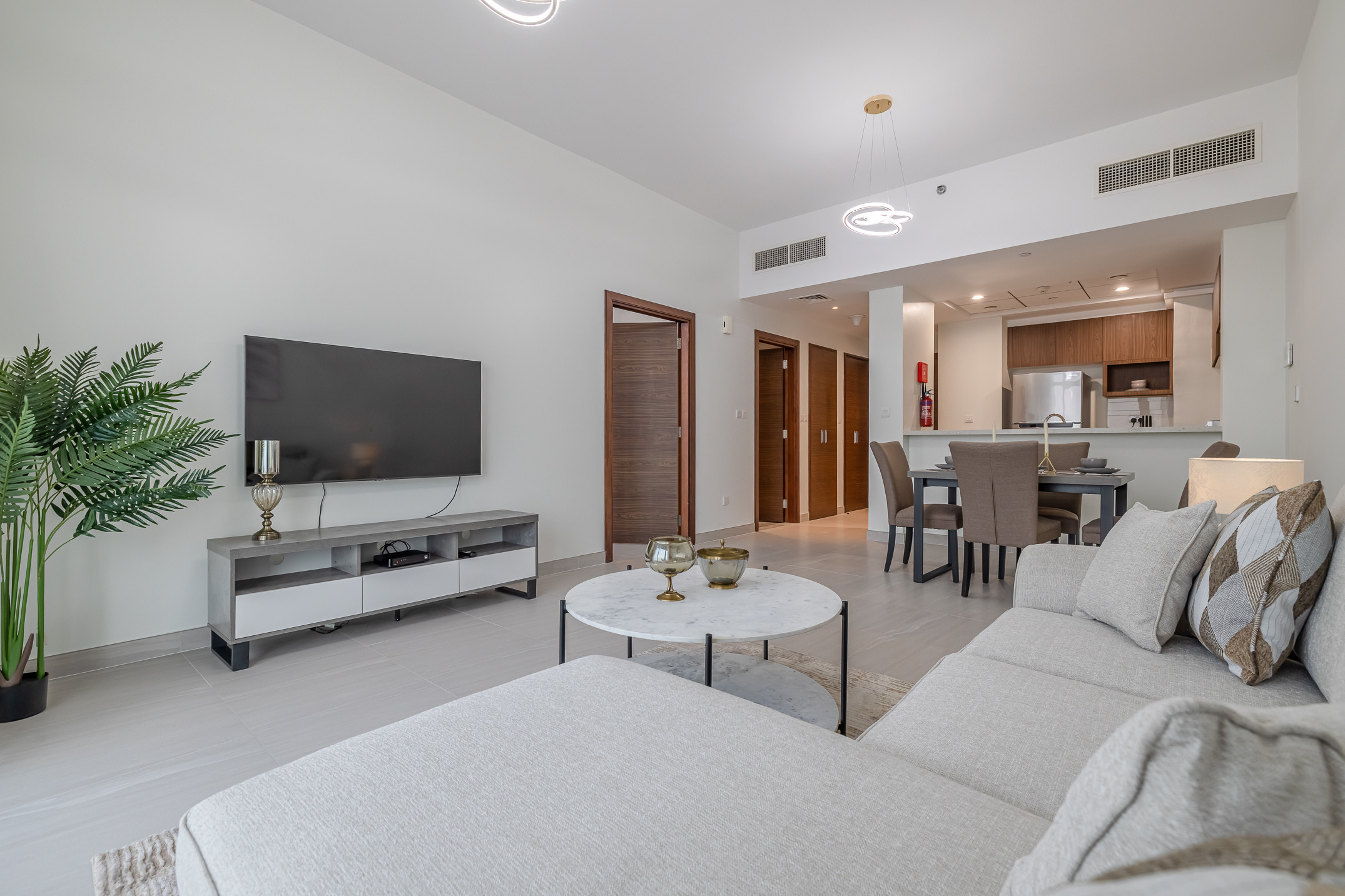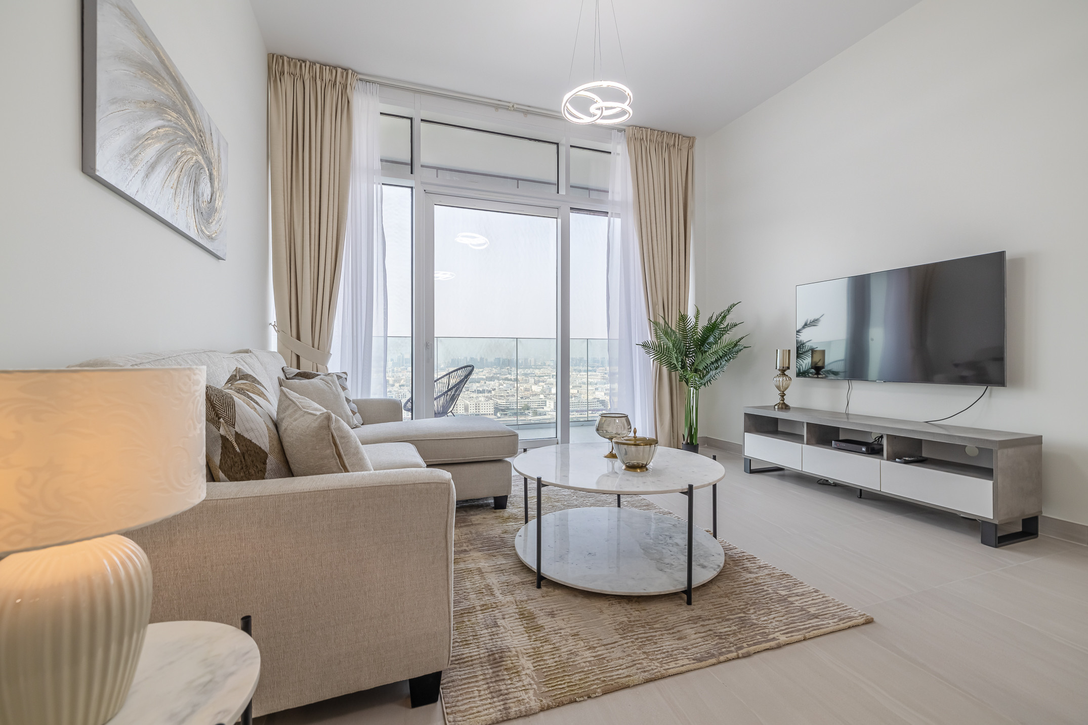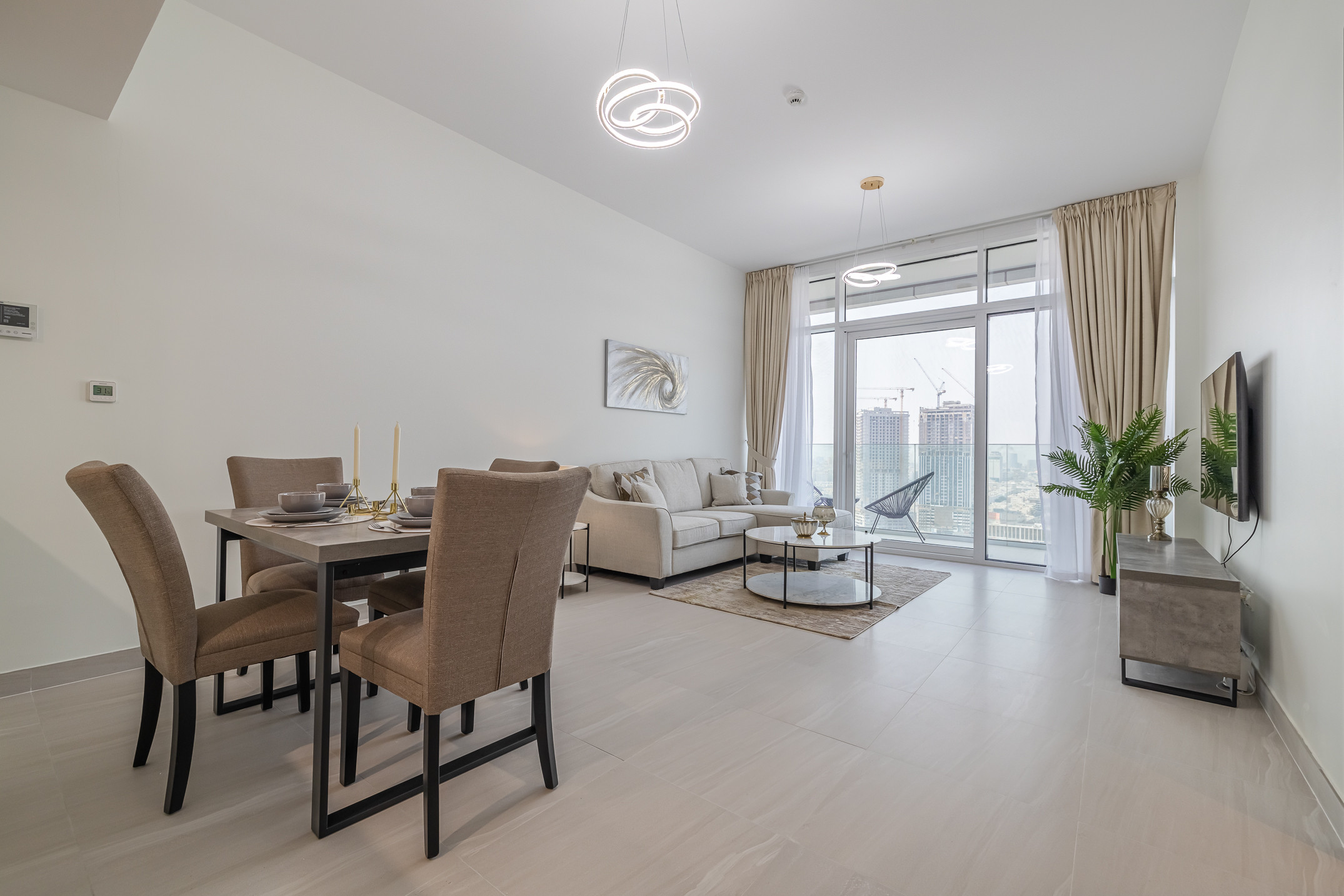 Modern 1 bedroom apartment located in Park Gate residences with beautiful views of the famous Dubai Frame. An elegant apartment that features high-end luxury furniture and a modern design. The layout is spacious and embraces warm undertones that feature collections of beautiful, graduated shades that all work together creating a balanced and welcoming look. Tastefully designed living room is styled with a large sofa, smart TV and dining area. The bedroom is spacious and styled with a minimalistic and modern touch, the king size bed is well set with fresh linens and high-quality pallet. The property features a fully equipped kitchen with all appliances, modern bathroom filled with toiletries and storage facilities. The ambience of the apartment is very cozy, spacious and ready to move in, with all the appliances to ensure a smooth and perfect stay.