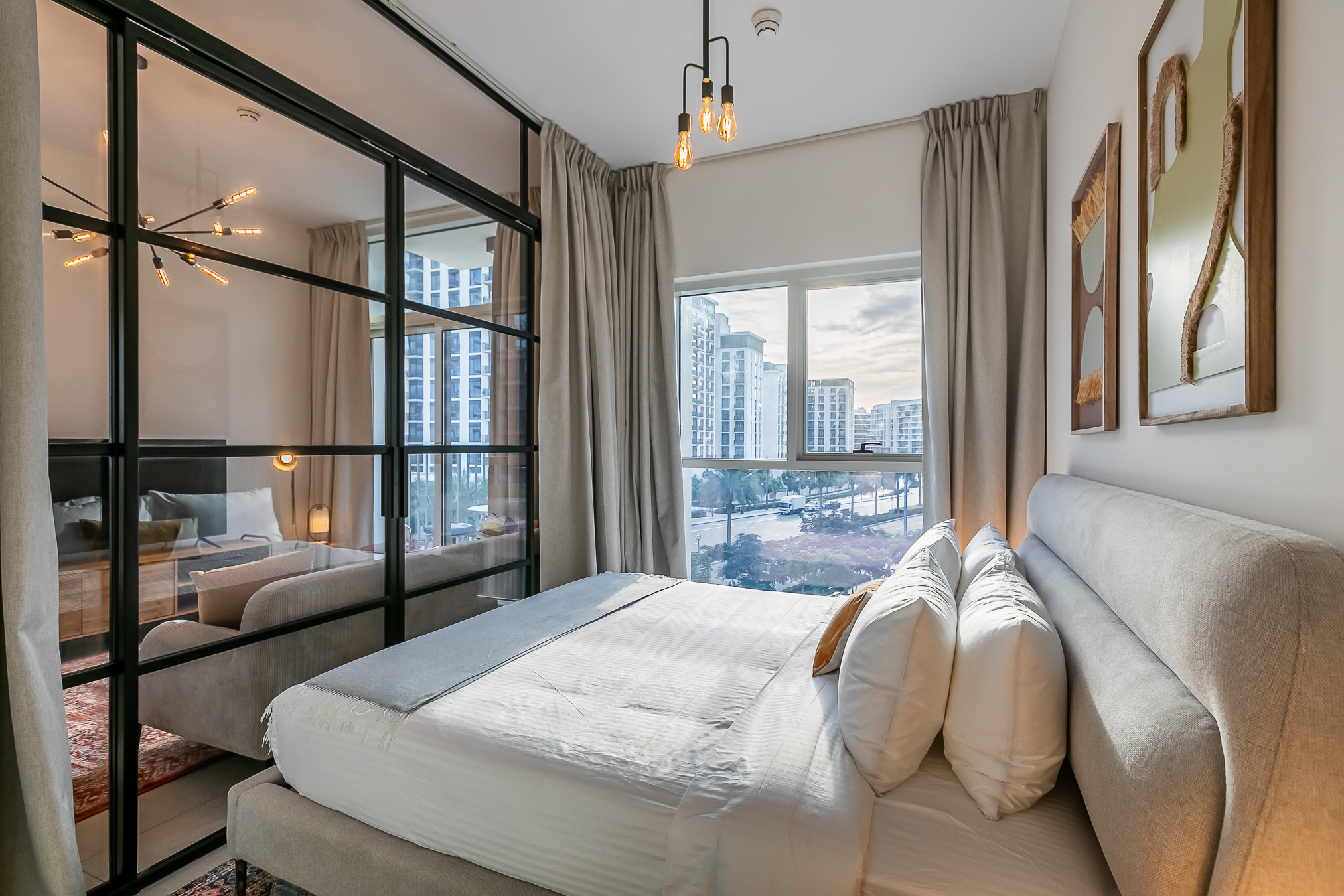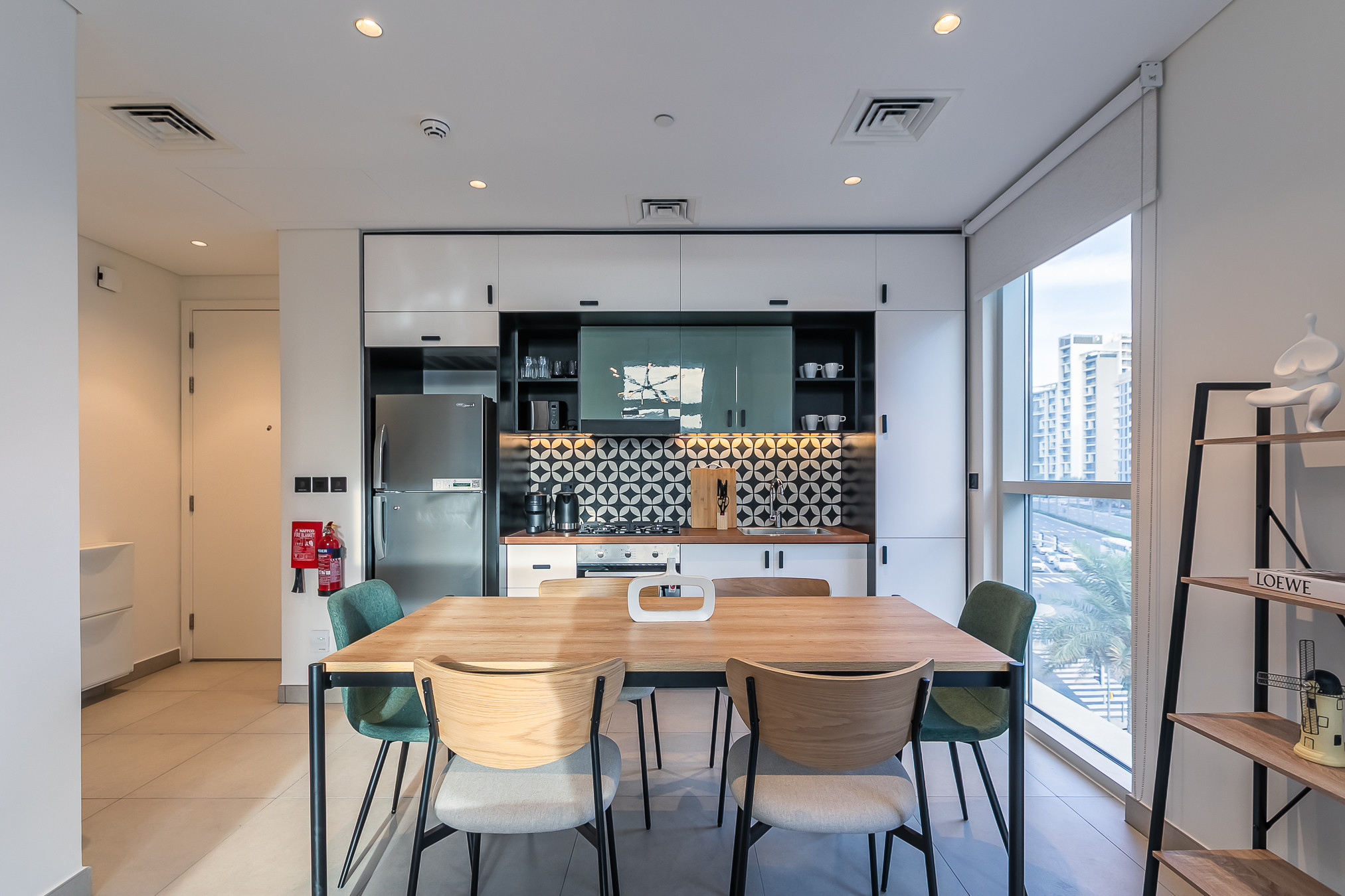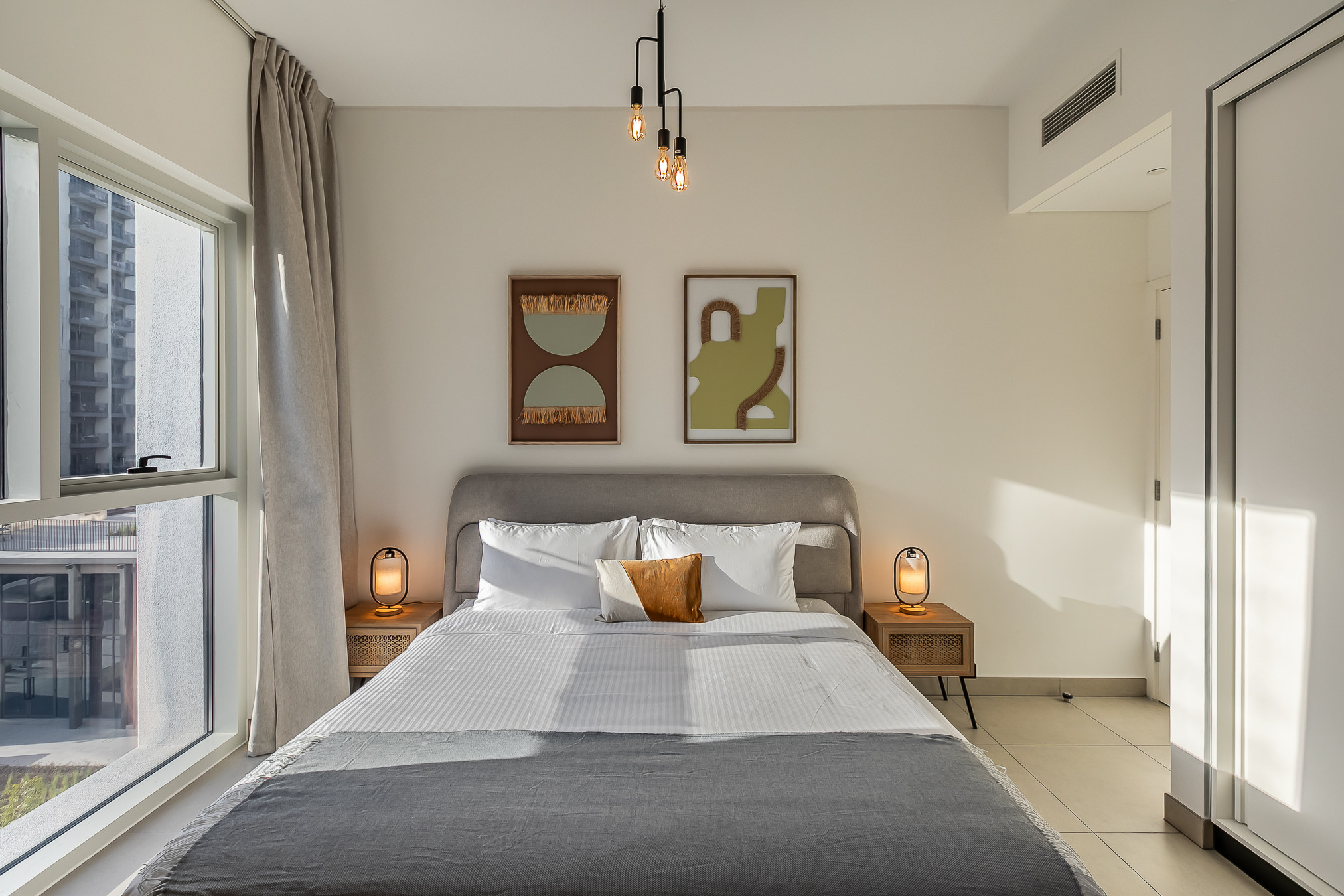 Spacious and stylish 2-bedroom apartment located in Dubai Hills. This apartment will amaze you with its beauty and comfort as the bedrooms are thoughtfully designed with high quality furniture and bed settings. The apartment reflects a tone of modernity and comfort. The bathroom is filled with toiletries and storage facilities. The kitchen is fully equipped with all the appliances, refrigerator, microwave, oven, washing machine, dishes/cutlery, kitchen utensils, toaster, kettle, vacuum etc. .The living room is well put together with a modern outlook, with a large sofa, smart TV and dining area overseeing beautiful views of the city.The home is always professionally cleaned and strategically sanitized for your safety. The apartment is very cozy, spacious, and ready to move in.