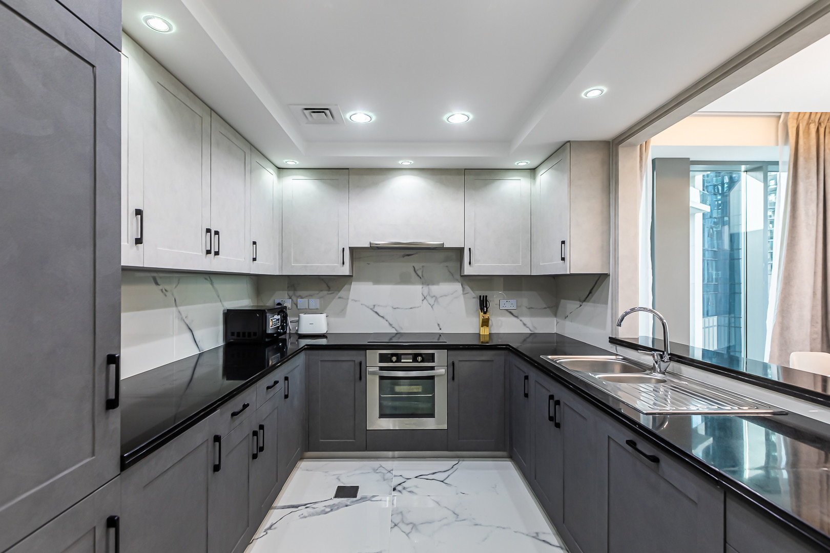 The open kitchen is fully equipped with everything you need — fridge, microwave, oven, toaster, kettle, washing machine, and more. Whether you're here for business or leisure, this apartment has all the essentials for a smooth and memorable stay.