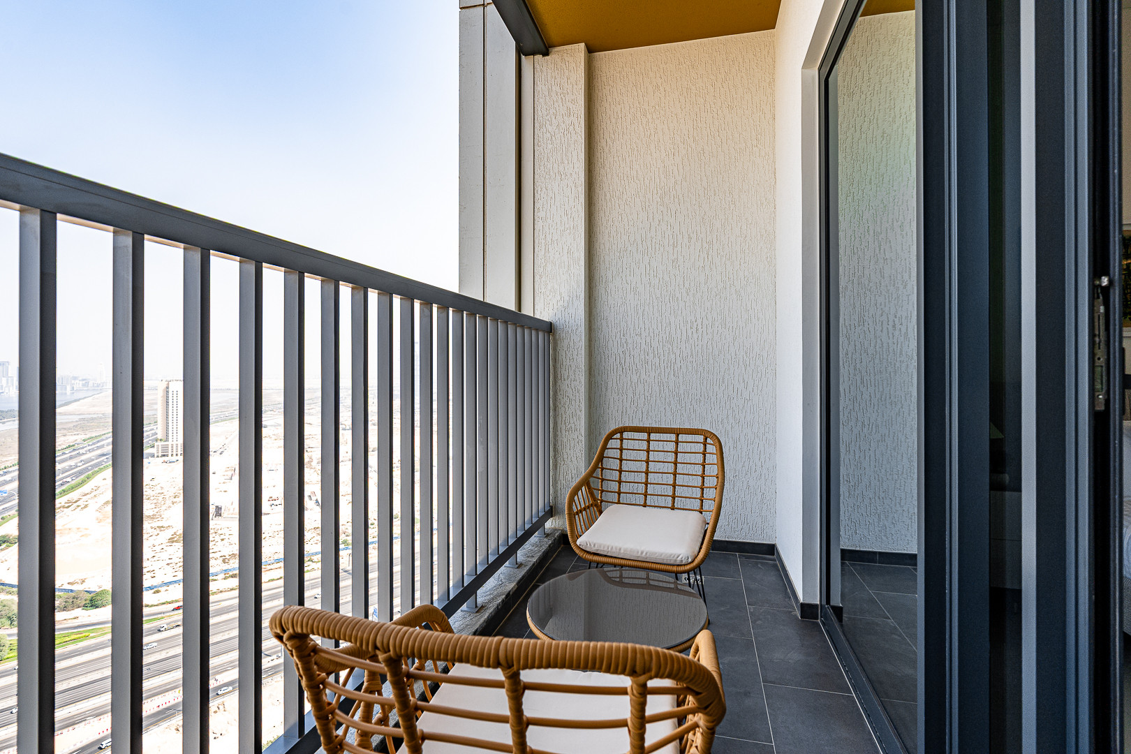 The bedroom offers a serene retreat, complete with a comfortable king-sized bed, premium linens, and access to a private balcony where you can unwind while enjoying the panoramic views. The balcony’s cozy seating area makes it an ideal spot for your morning coffee or evening relaxation.