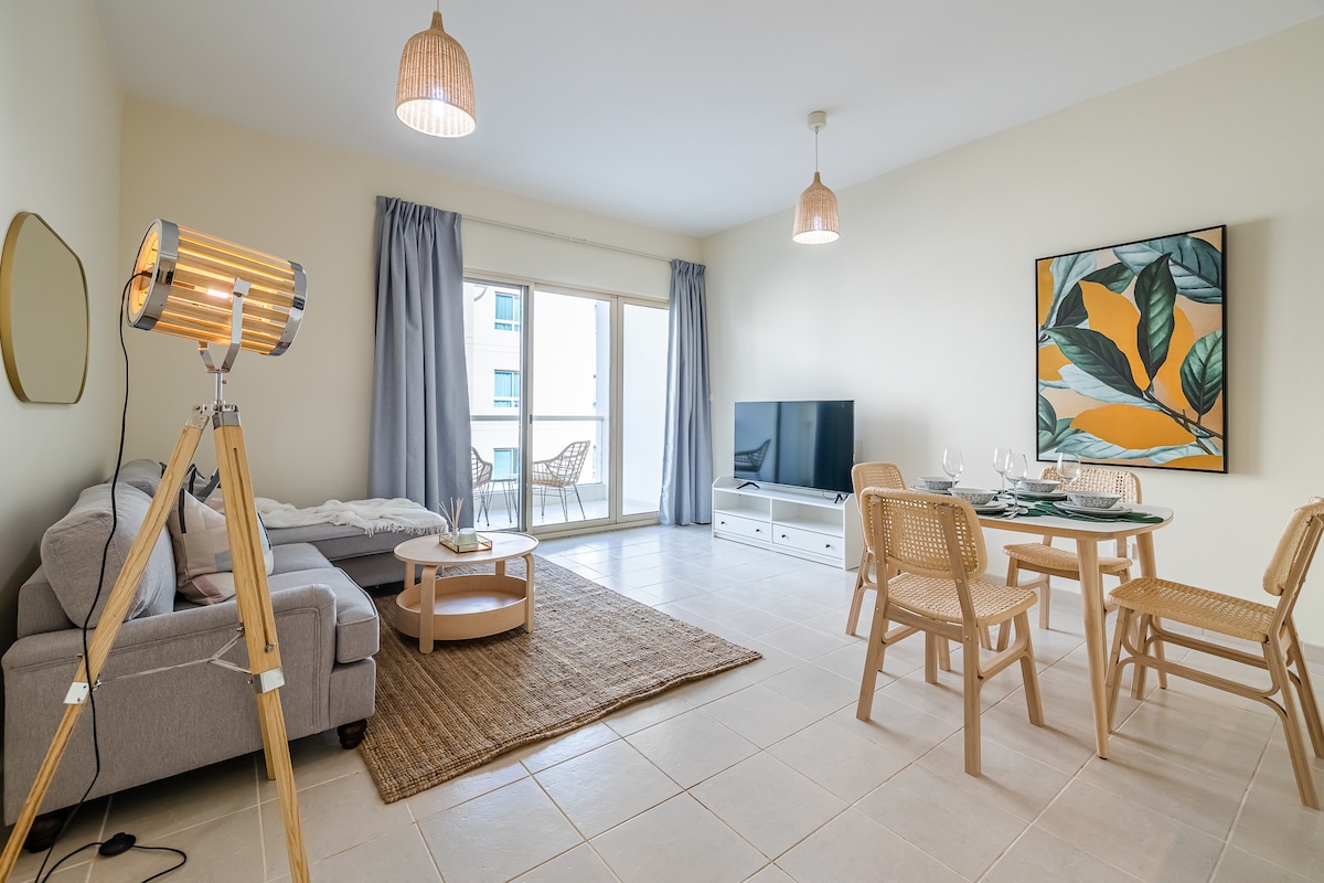 Spacious and stylish 1-bedroom apartment located in Madinat Jumeirah Living. This apartment will amaze you with its beauty and comfort as the bedrooms are thoughtfully designed with high quality furniture and bed settings. The apartment reflects a tone of modernity and comfort. The bathrooms are filled with toiletries and storage facilities. The kitchen is fully equipped with all the appliances, refrigerator, microwave, dishwasher, oven, washing machine, dishes/cutlery, kitchen utensils, coffee machine, toaster, kettle, vacuum etc. .The living room is well put together with a modern twist and a classic look, with a large sofa, smart TV and dining area overseeing beautiful views of the nature & the city. The home is always professionally cleaned and strategically sanitized for your safety. The apartment is very cozy, spacious, and ready to move in.