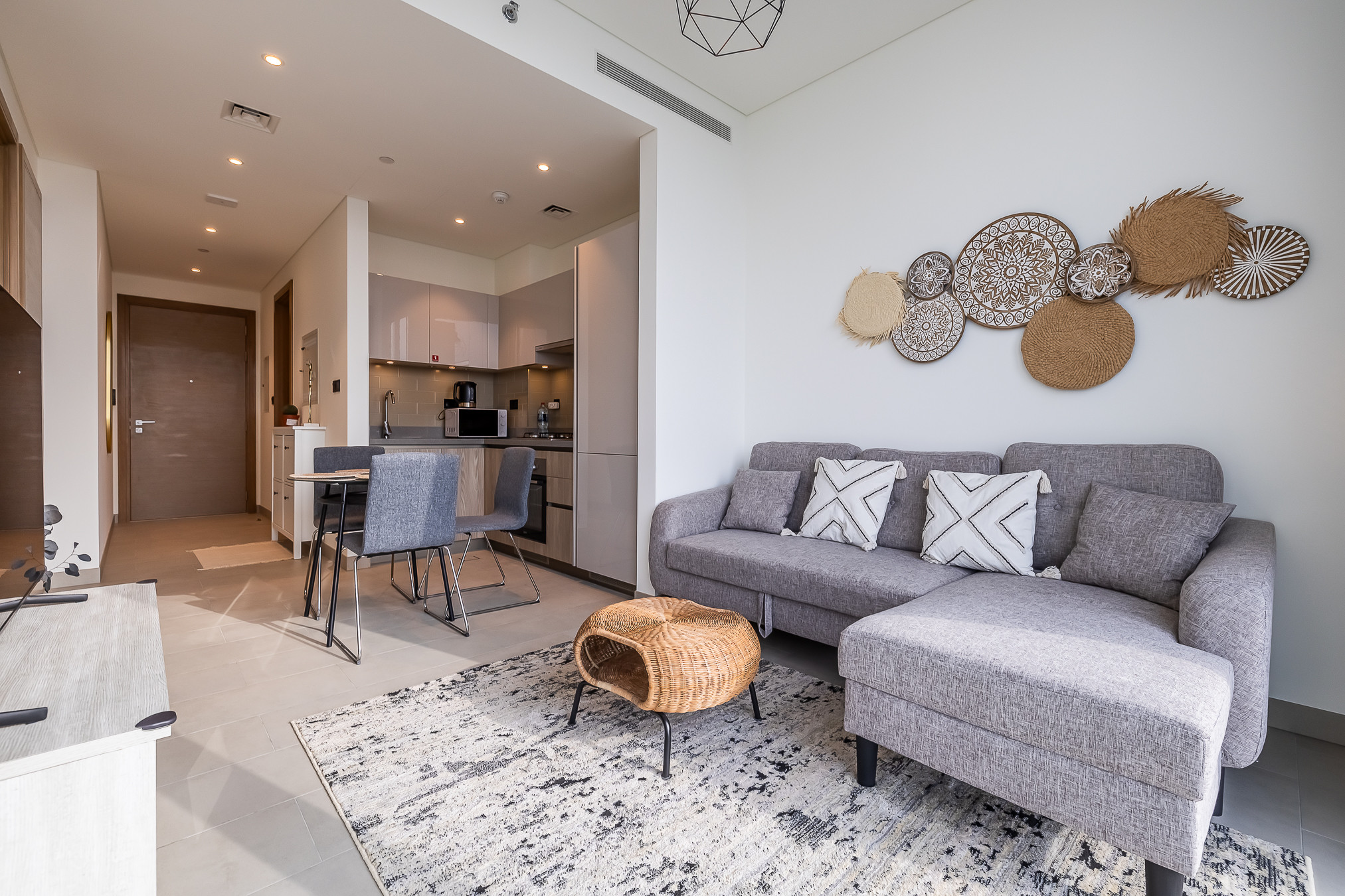 Step into comfort and elegance with this beautifully furnished 1-bedroom apartment located in the prestigious Sobha Waves at Sobha Hartland. Designed with neutral tones, clean lines, and contemporary furniture, the apartment radiates tranquility and style—perfect for both short-term stays and longer visits.
