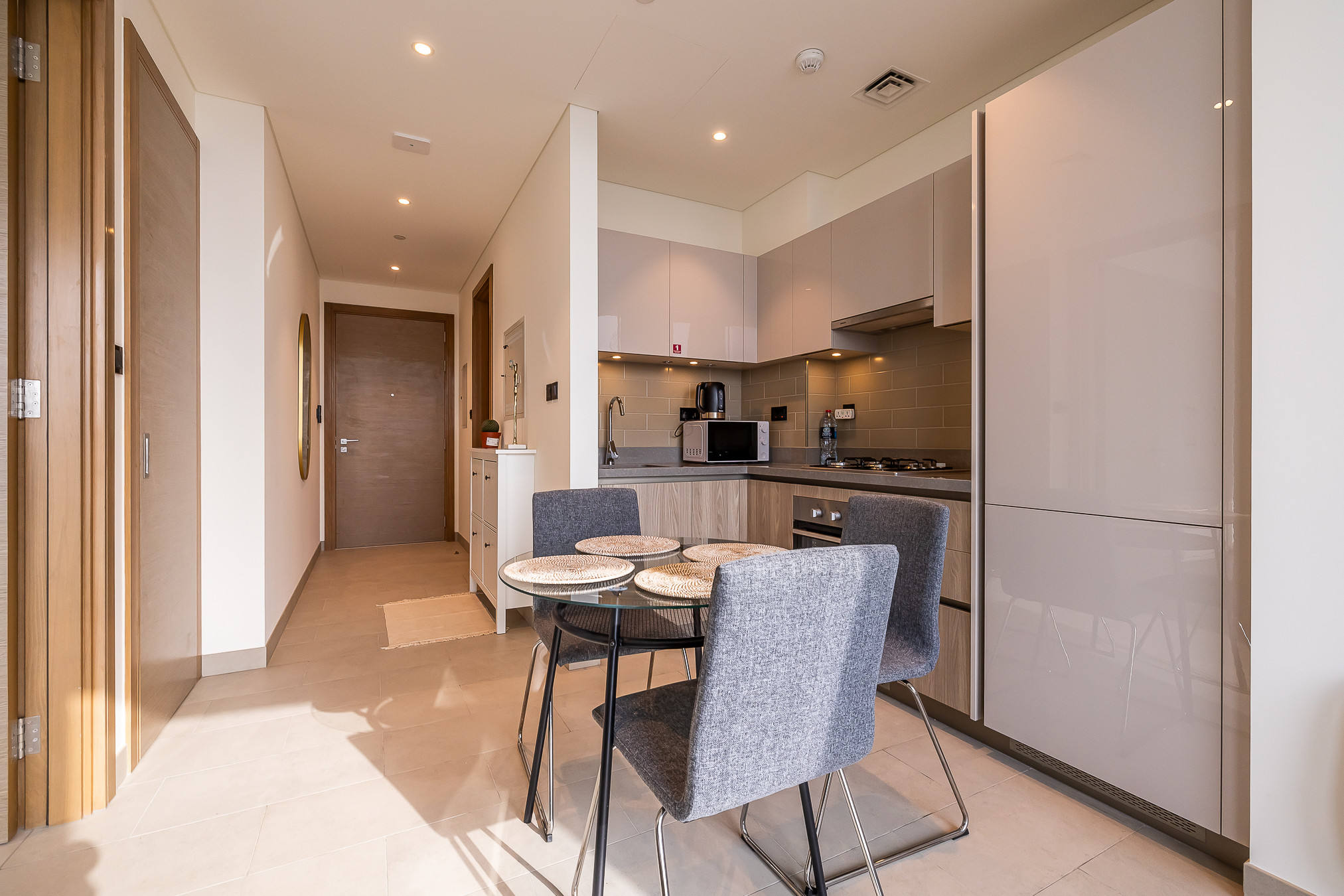 Spacious and stylish 1-bedroom apartment located in Madinat Jumeirah Living. This apartment will amaze you with its beauty and comfort as the bedrooms are thoughtfully designed with high quality furniture and bed settings. The apartment reflects a tone of modernity and comfort. The bathrooms are filled with toiletries and storage facilities. The kitchen is fully equipped with all the appliances, refrigerator, microwave, dishwasher, oven, washing machine, dishes/cutlery, kitchen utensils, coffee machine, toaster, kettle, vacuum etc. .The living room is well put together with a modern twist and a classic look, with a large sofa, smart TV and dining area overseeing beautiful views of the nature & the city. The home is always professionally cleaned and strategically sanitized for your safety. The apartment is very cozy, spacious, and ready to move in.