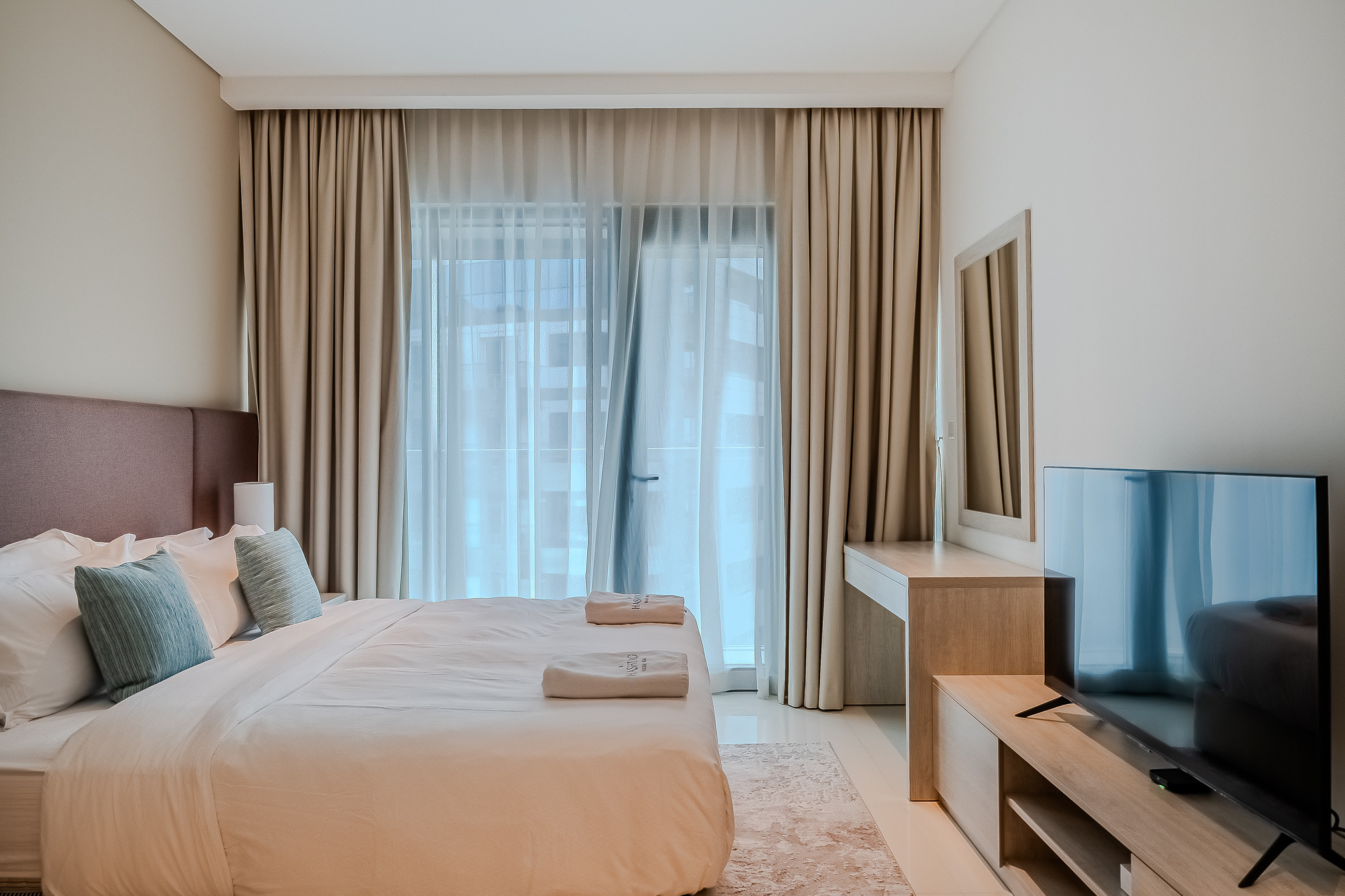 Stylish Studio apartment located in JVC. The apartment has an amazing vibe and plenty of natural light emerging through the floor to ceiling window. Clean linens, minimal furnishings and a simple color scheme that coordinates beautifully with the great outdoors makes this space welcoming. The apartment has a very welcoming and comforting ambience. Styled with a large sofa, smart TV and dining area – this apartment will fascinate you with its functionality and simplicity. The kitchen is fully equipped with all appliances and the modern bathrooms are filled with toiletries. The bed is topped with high quality pallet, fresh linen and towels. Our guests can simply move in and start living as this lovely apartment is equipped with everything they might need, to ensure a smooth and perfect stay!