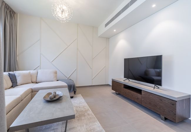 The villa is flooded with natural light through its large windows and features a spacious living area with a comfortable sofa, smart TV, and a dining area. The kitchen is fully equipped with top-quality appliances, making it easy to cook and entertain. All three bedrooms come with king-size beds, premium mattresses, fresh linen, and en-suite bathrooms with their own private balconies. A maid’s room with a private bath adds further convenience.