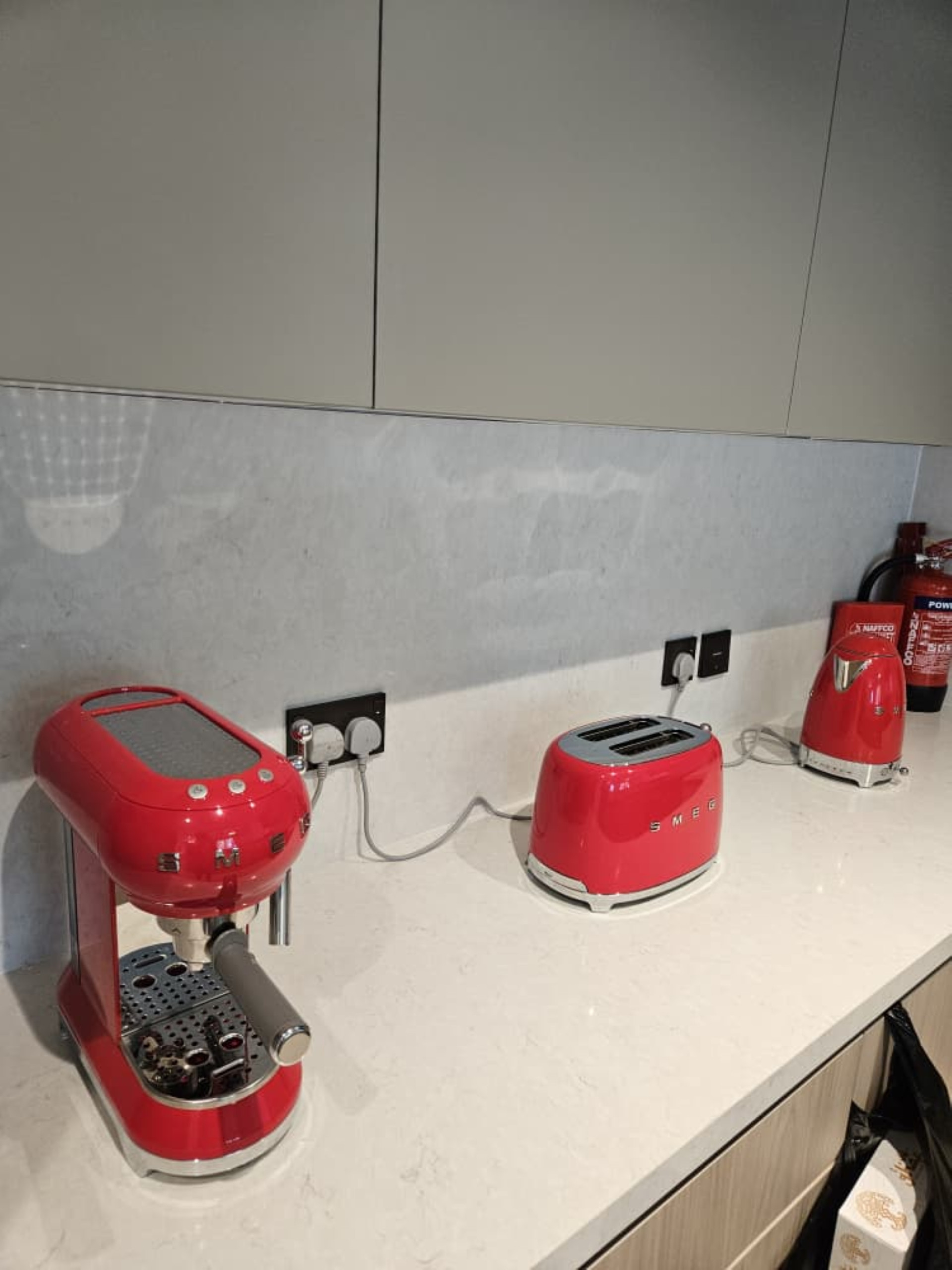 Кухня, оборудовано холодильник, микроволновая печь, духовка, столовые приборы, кофеварка, тостер и Чайник.