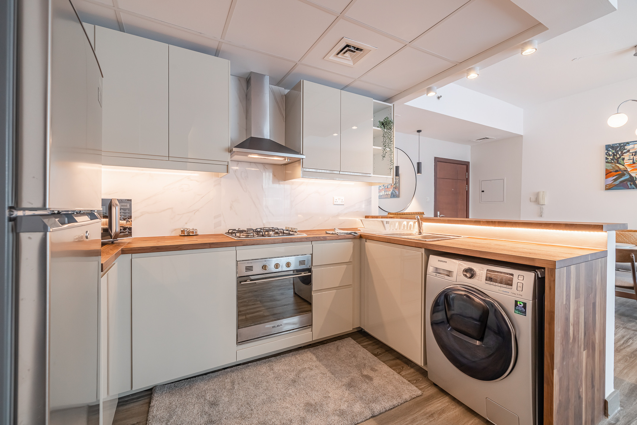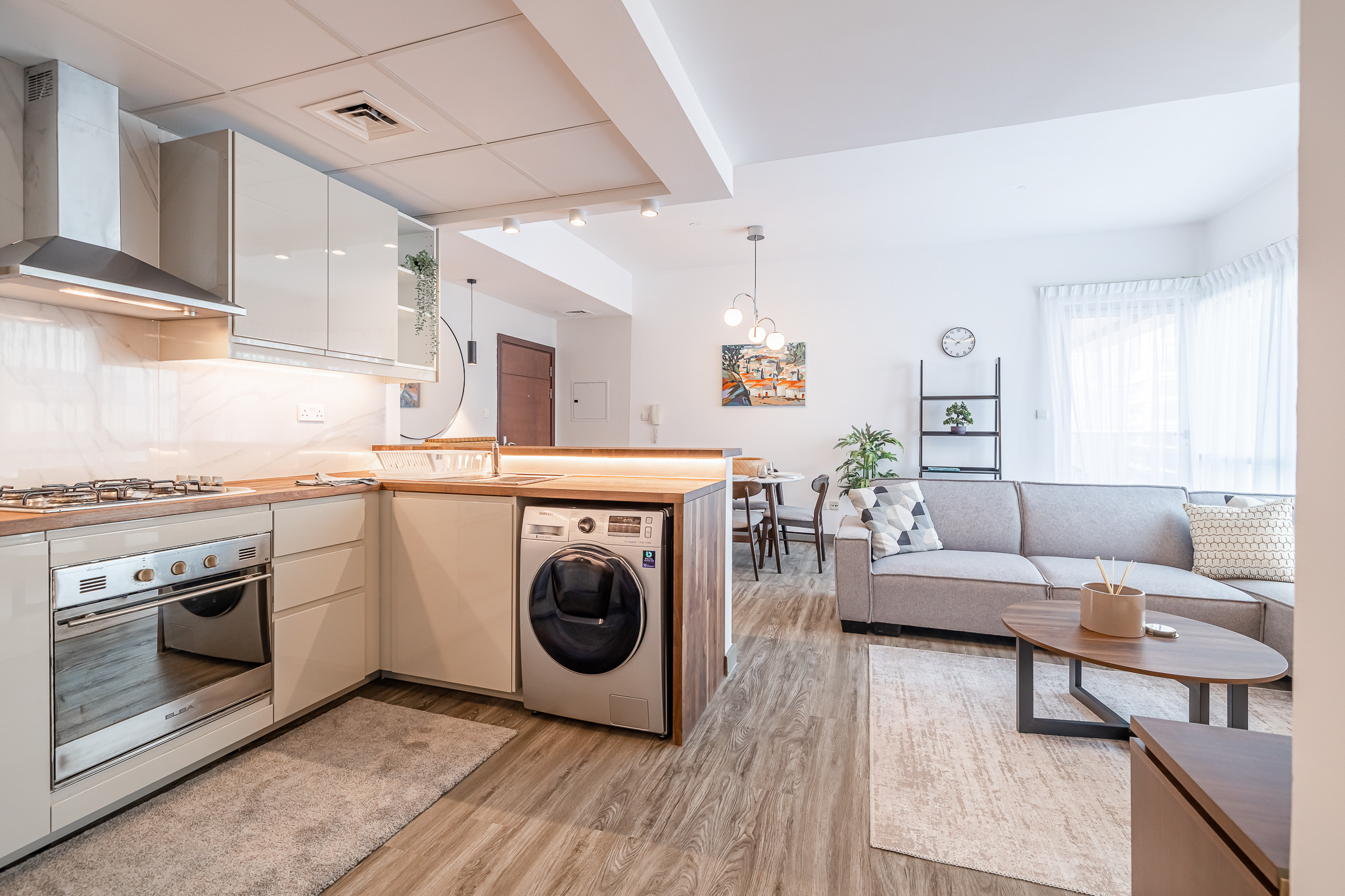 Размещение имеет стиральная машина, утюг, Фен, Балкон, Тренажерный зал, кондиционер, бассейн жилого комплекса, гараж, 1 телевизор.