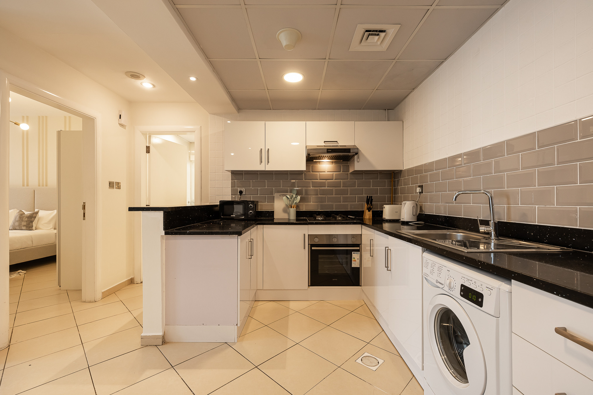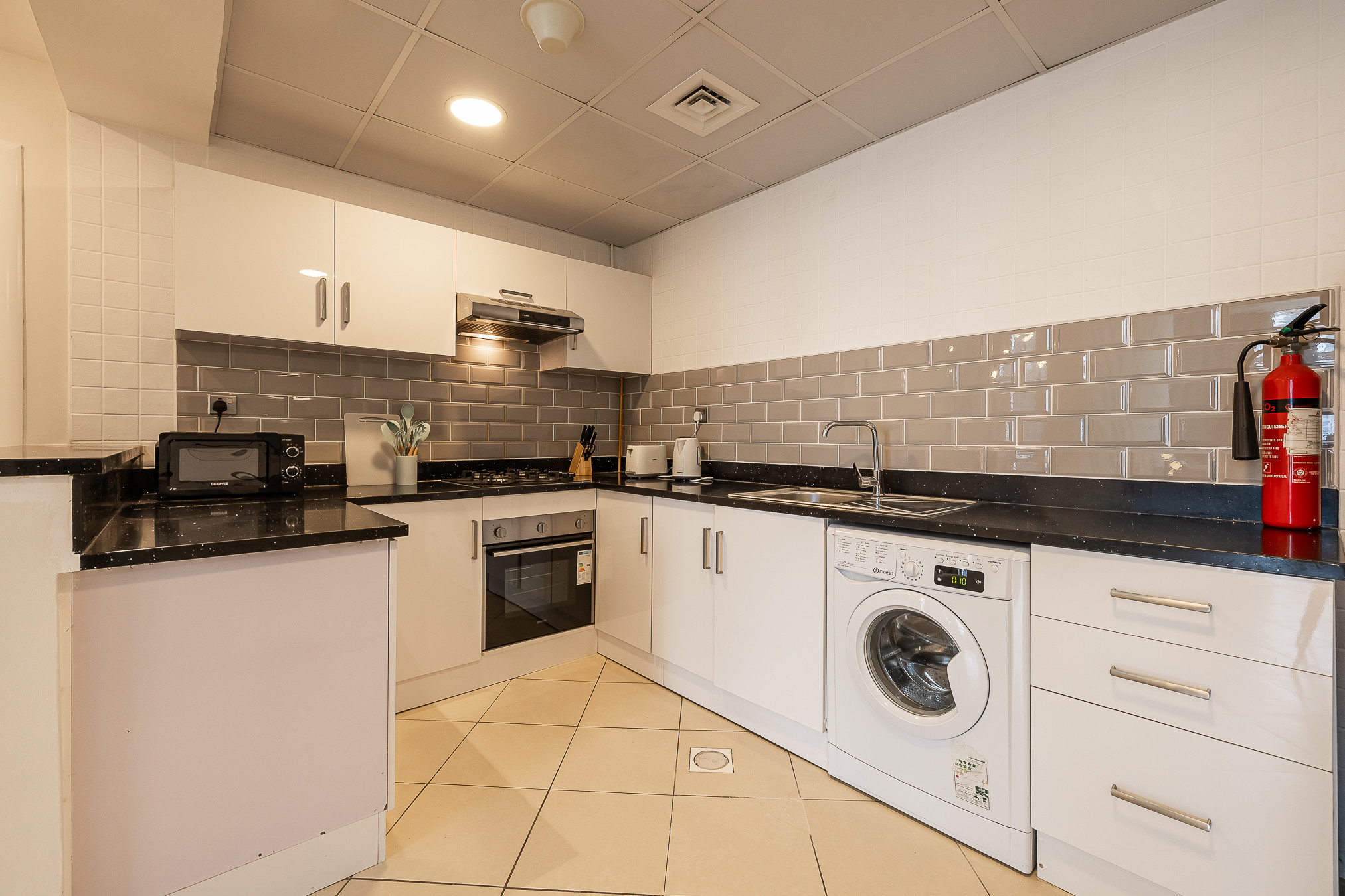 Кухня, оборудовано холодильник, микроволновая печь, духовка, столовые приборы, кухонная утварь и тостер.