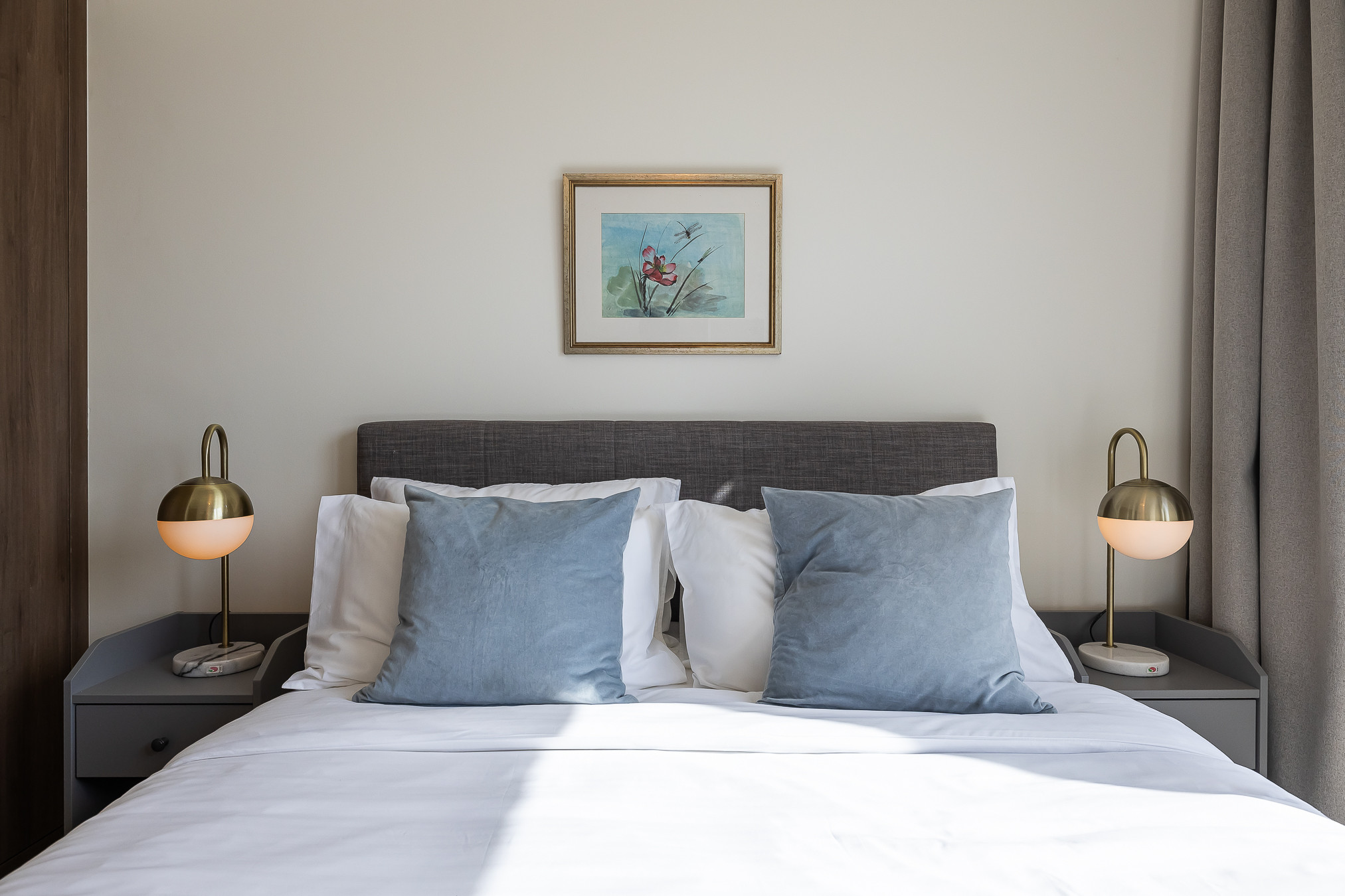 Размещение имеет стиральная машина, утюг, Фен, Балкон, Тренажерный зал, кондиционер, бассейн жилого комплекса, гараж, 1 телевизор.